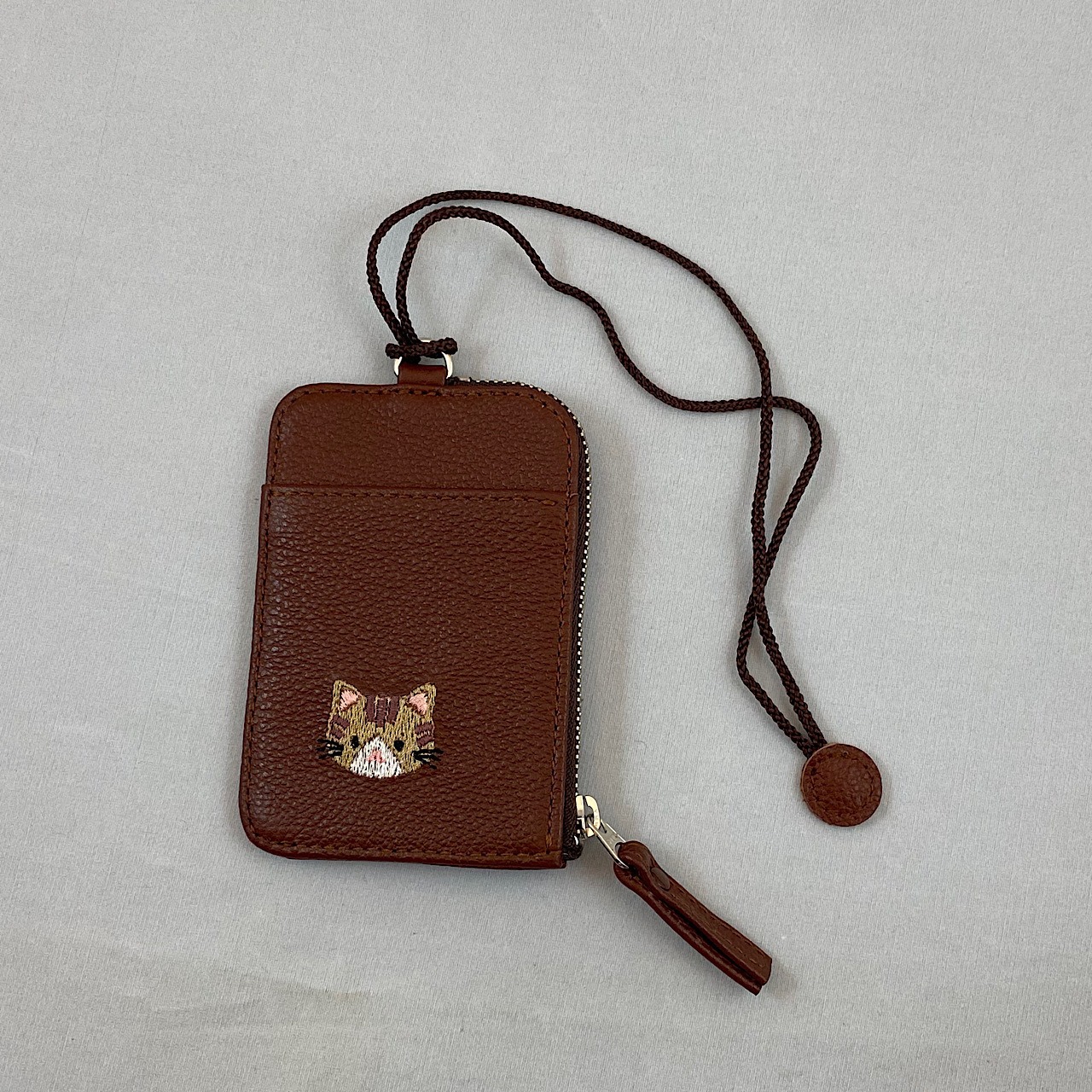焦げ茶の牛革に茶トラ猫の刺繡を施しています。