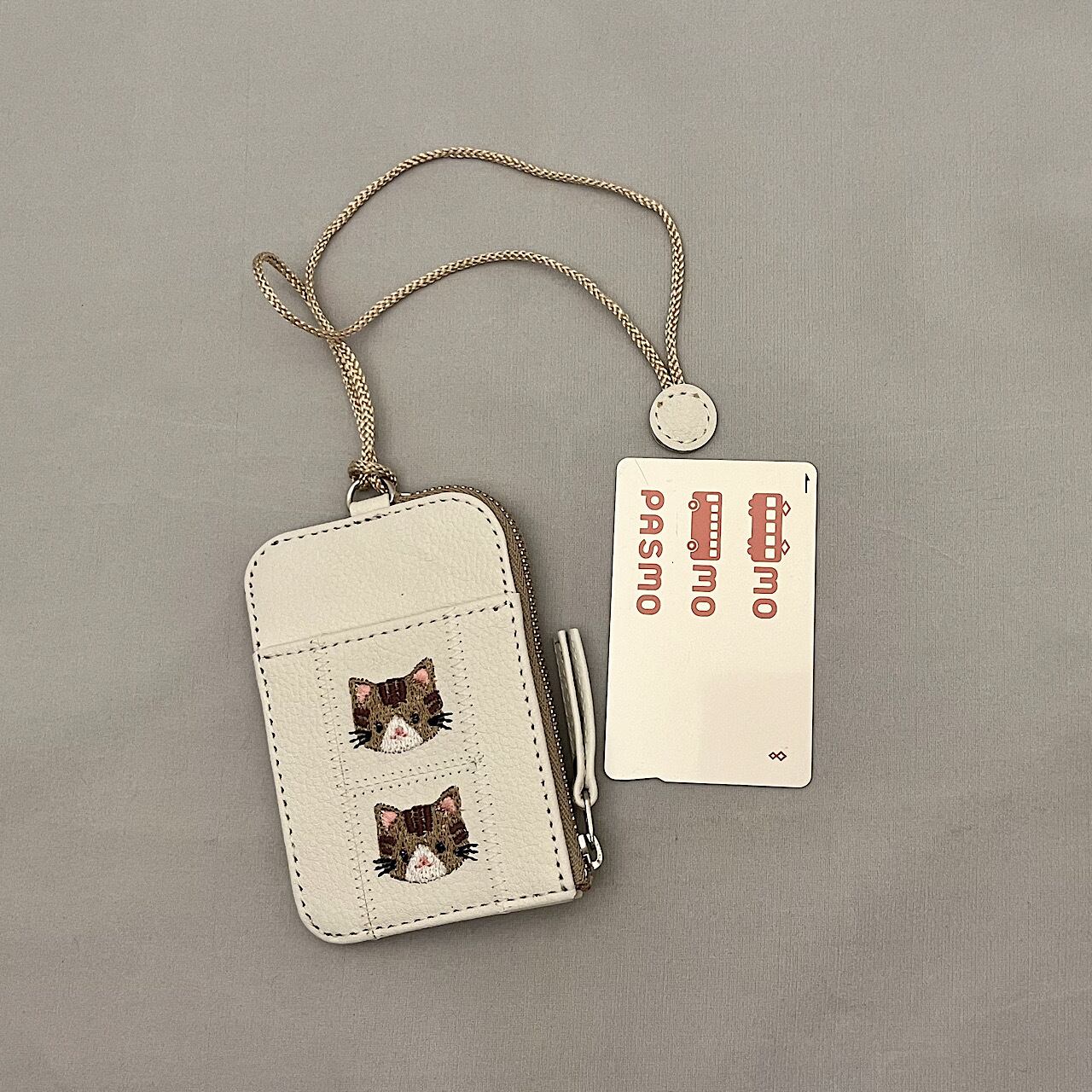 パスケース(小銭入れ付き、2枚用、オフホワイトに茶トラ猫の刺繍)No.03003-15