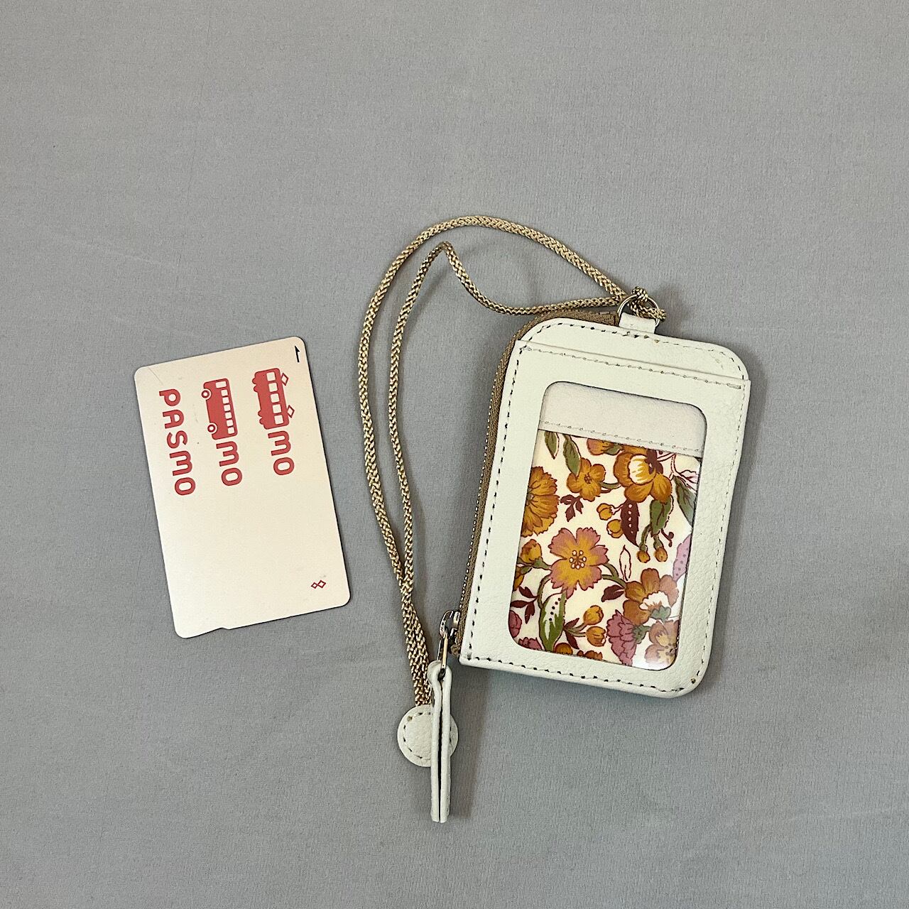 裏表両面にカードポケットがあり、間に小銭等が入るファスナーポケット付きのパスケースです。