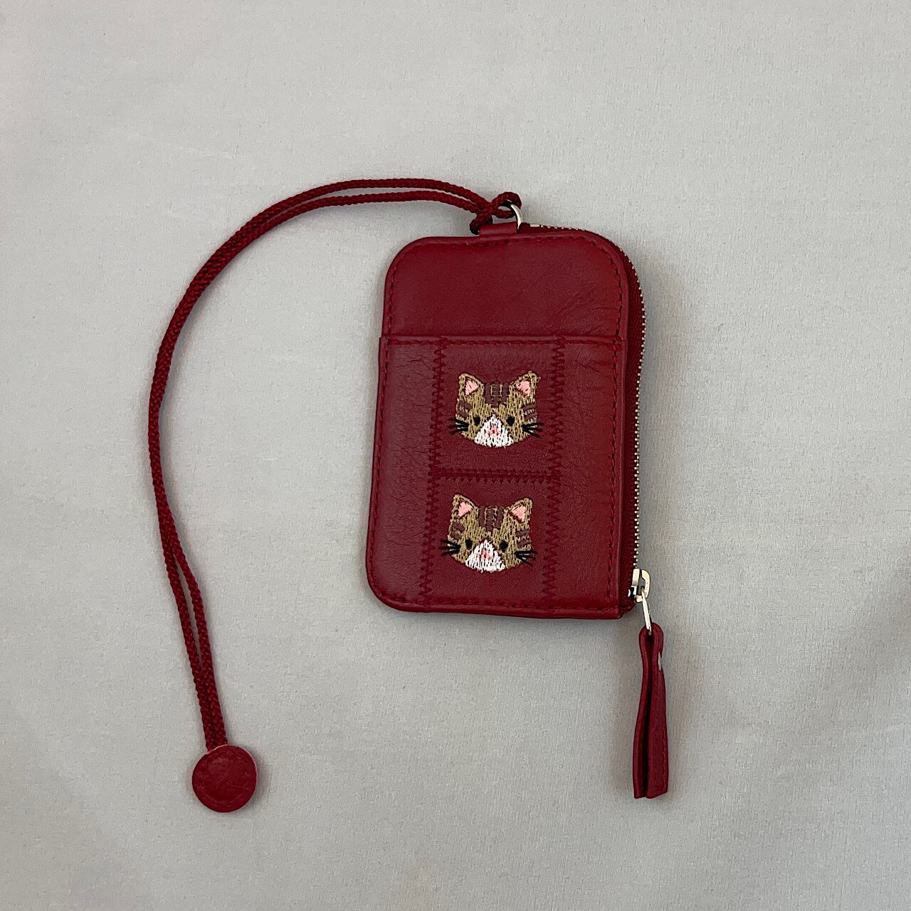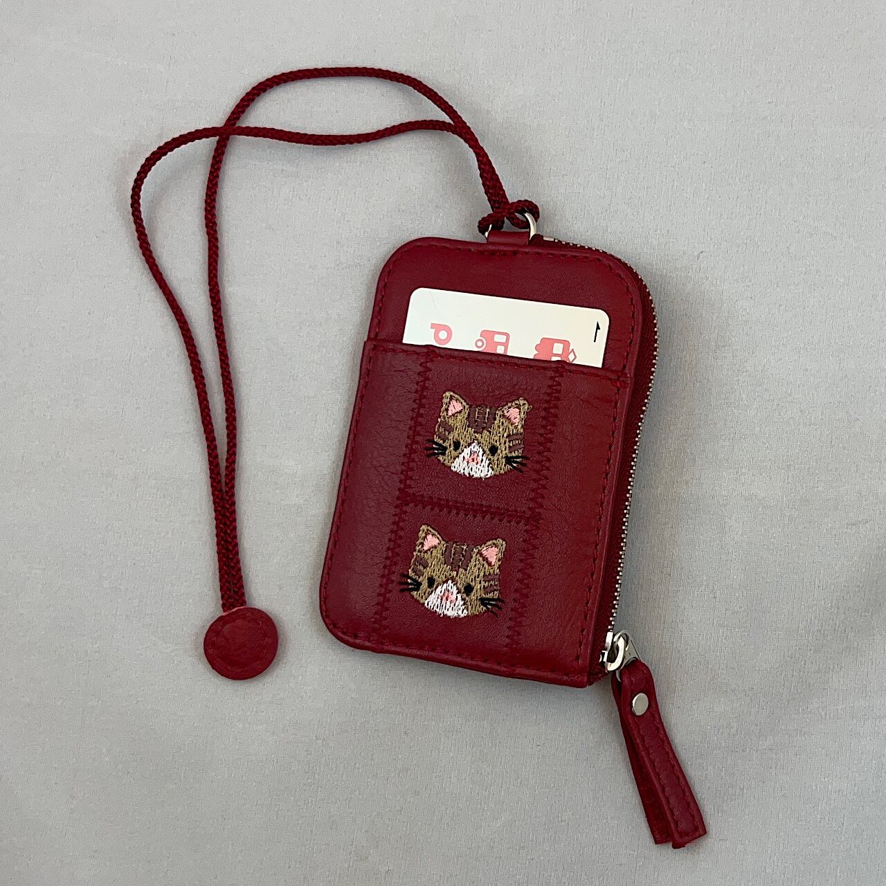 パスケース(小銭入れ付き、2枚用、ワインに茶トラ猫の刺繍)No.03003-18