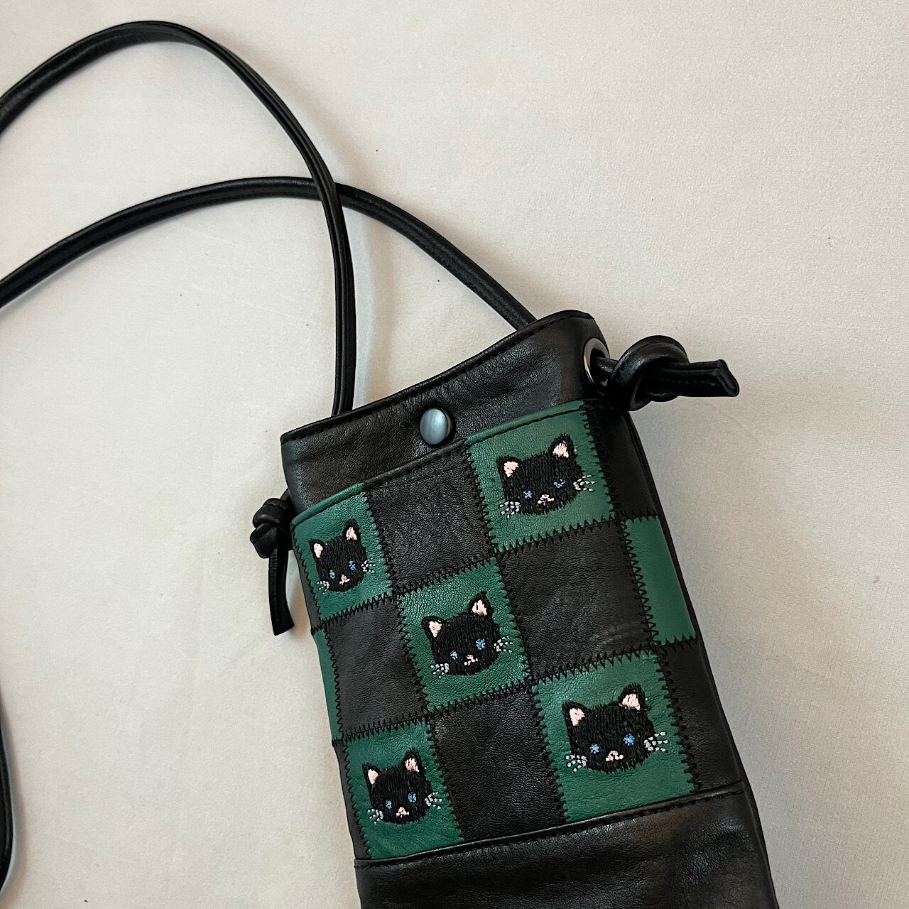 グリーンの牛革に黒猫の刺繡を施し、黒い革と合わせてパッチワークをして作りました。