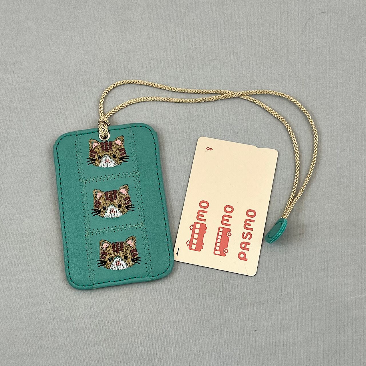 パスケース1枚用(ミントグリーンに茶トラ猫の刺繍)No.03004-39