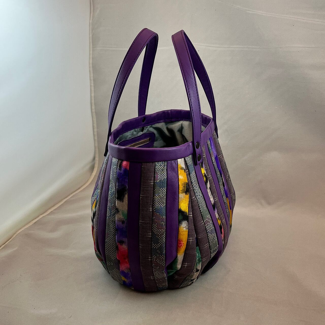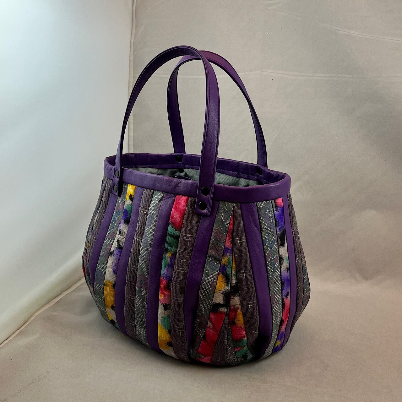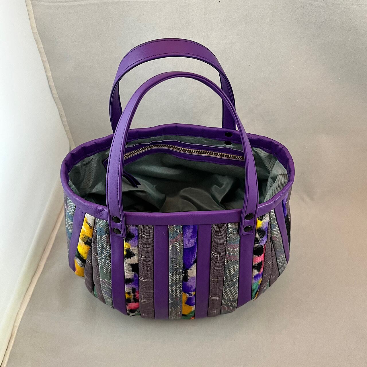 紫の牛革と大島紬や銘仙などを組ませて作りました。