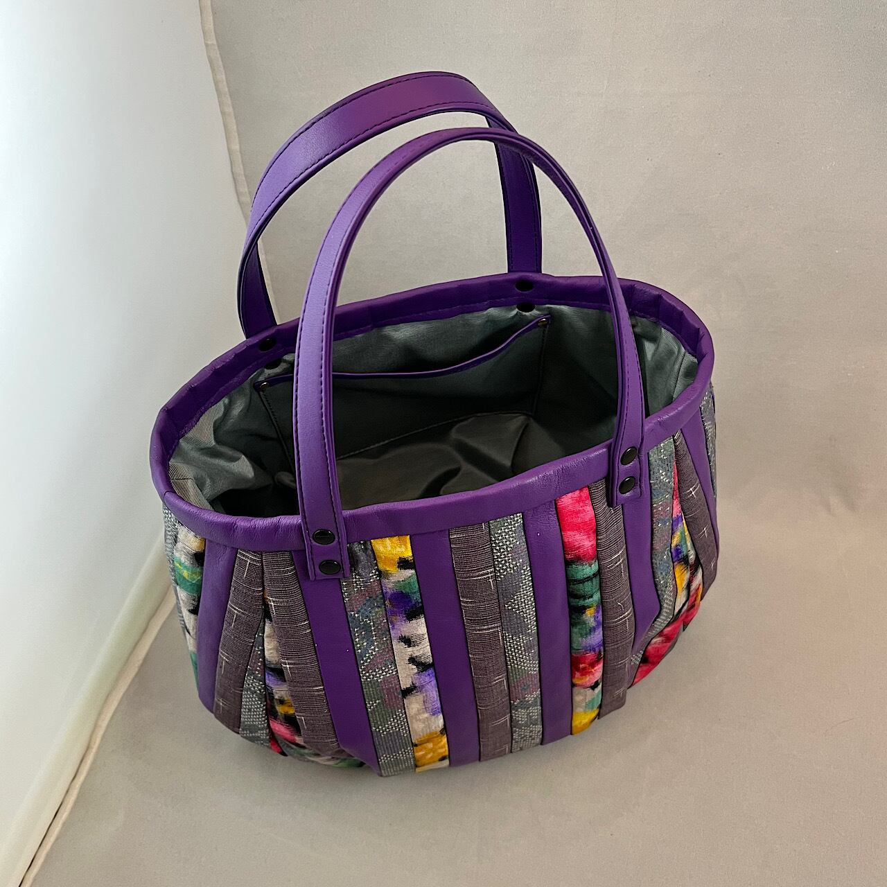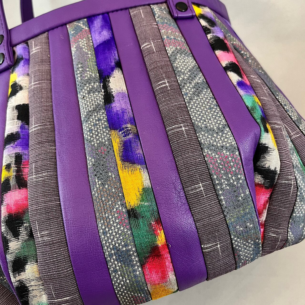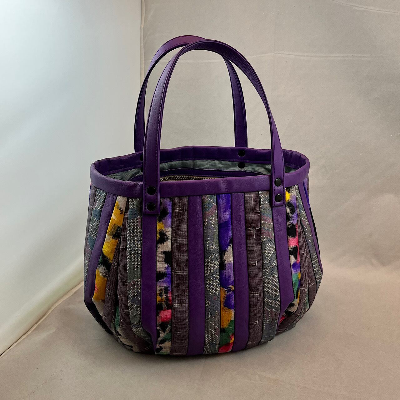 紫の牛革と大島紬や銘仙などを組ませて作りました。