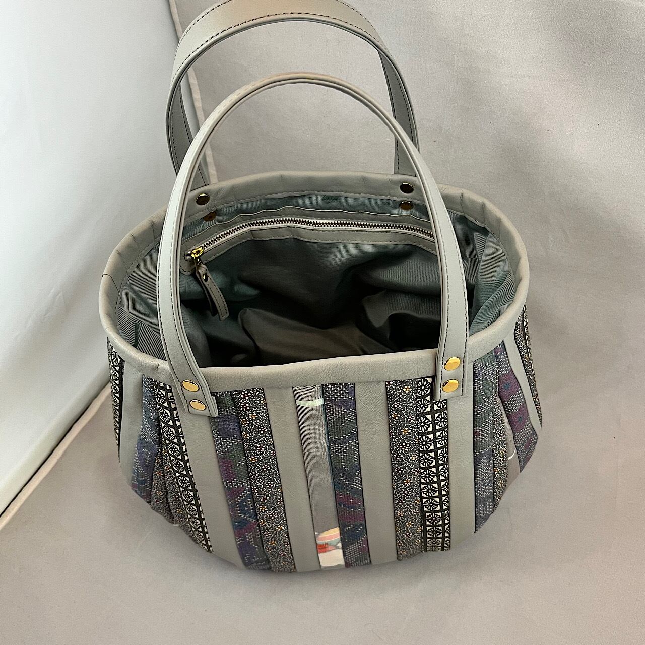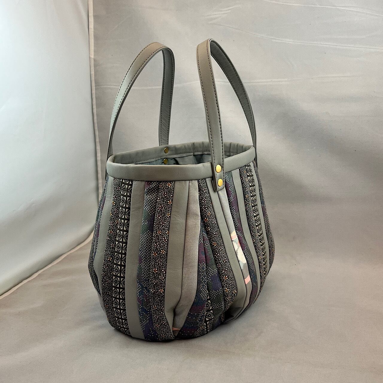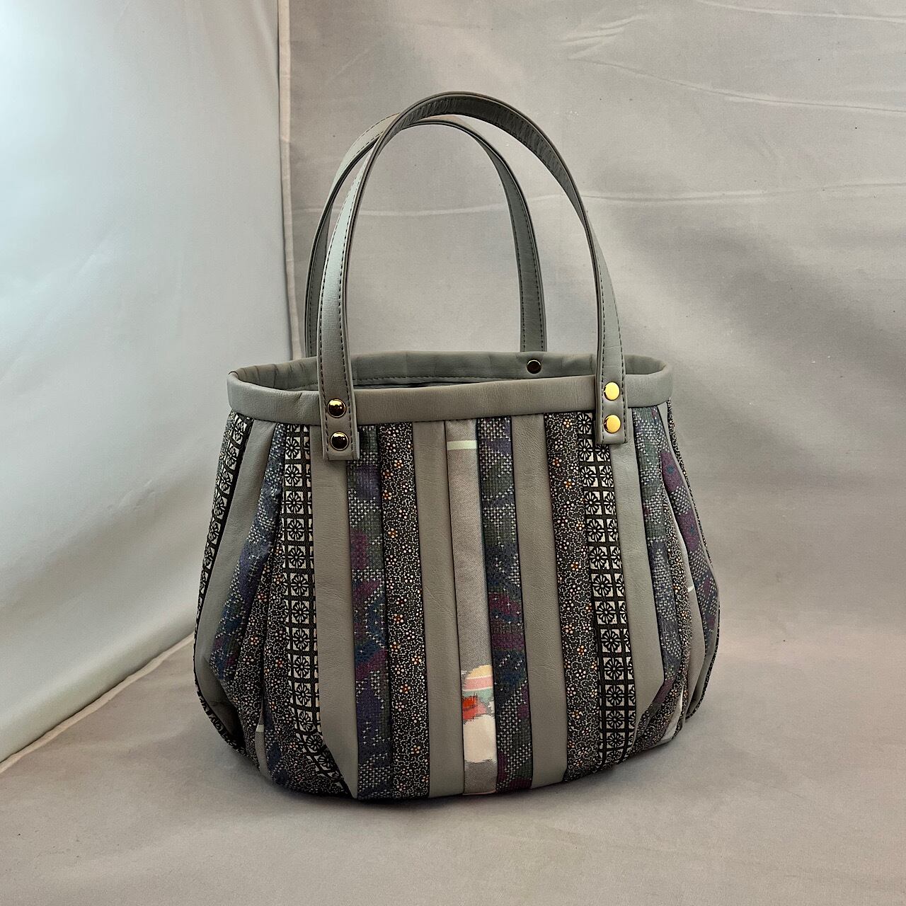 革と古布のパッチワークバッグ(グレー系の紬、小紋など) No.01016-09