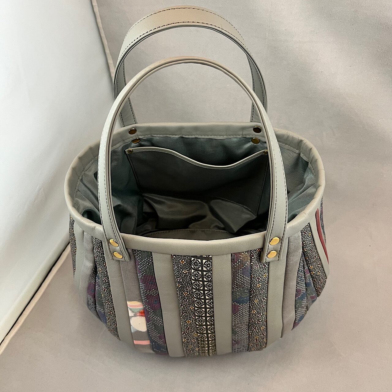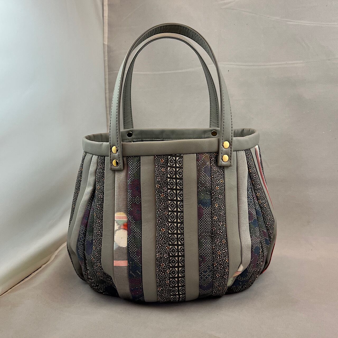 私は普段は革のバッグを作っていますが、布も好きです。殊に昔の着物の生地が好きで買い集めた古布や 祖母の時代から家にある着物を使ってバッグを作りました。