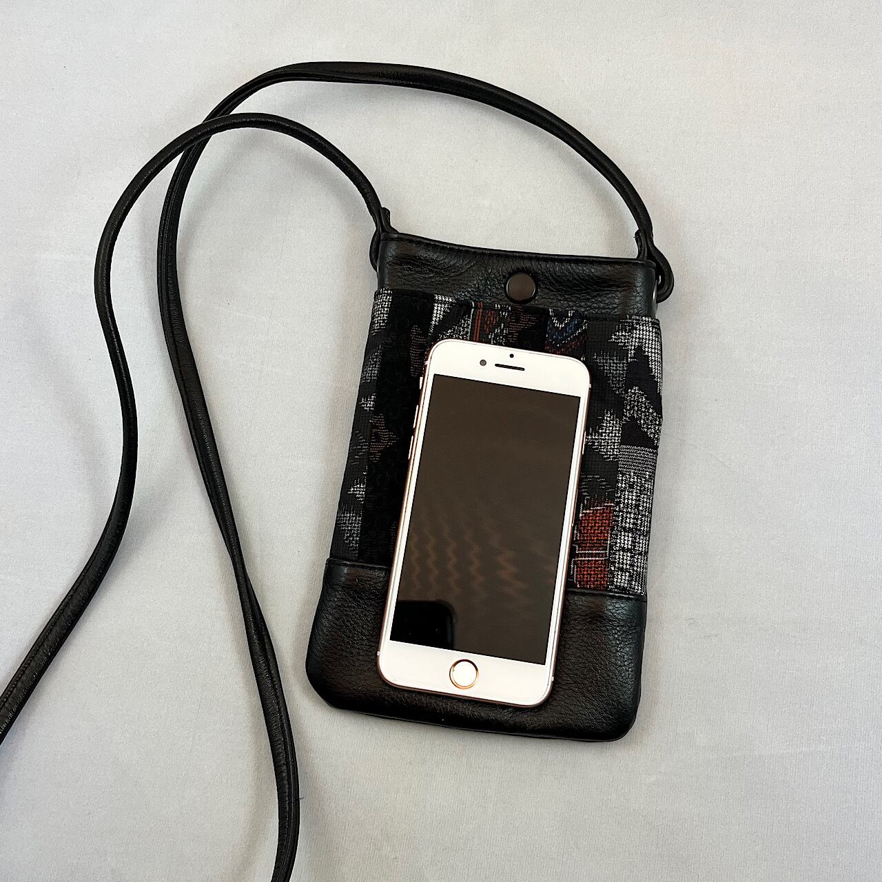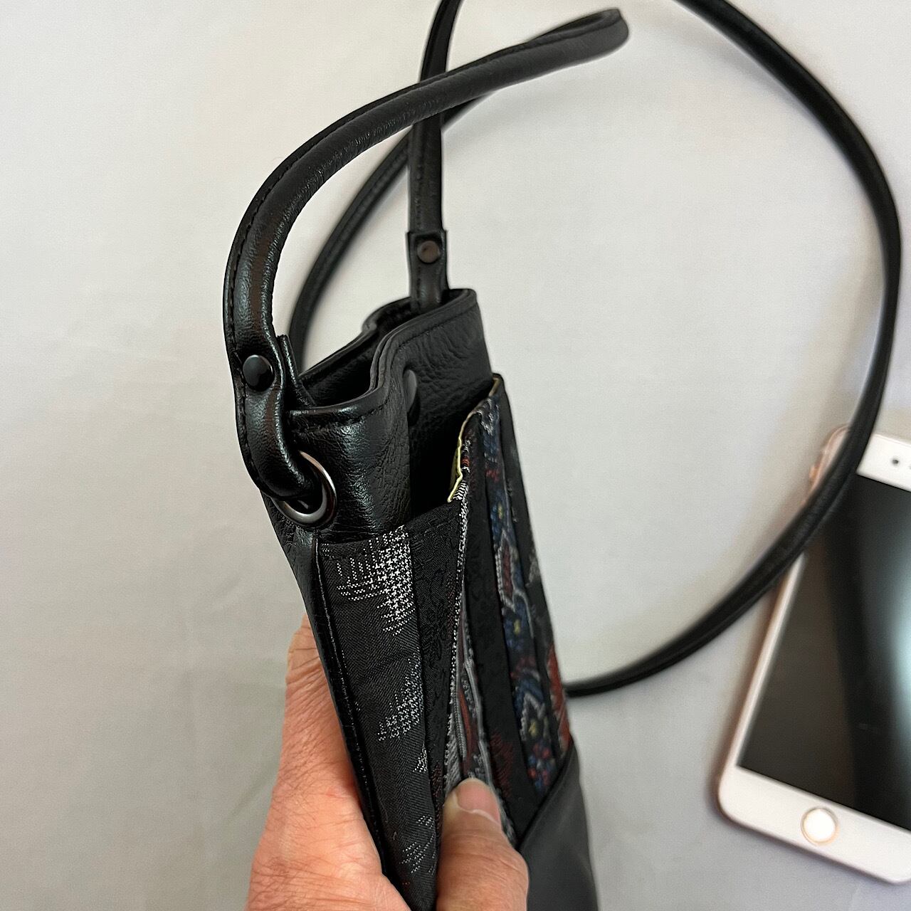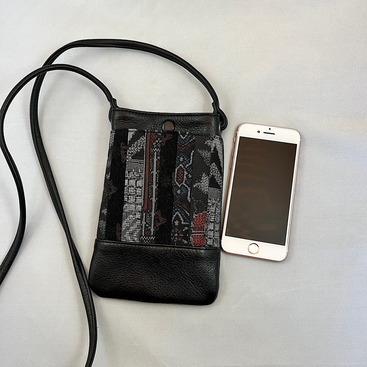 スマホポシェット(黒の革+紬などの古布パッチワーク)No.01014-04