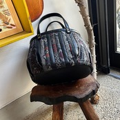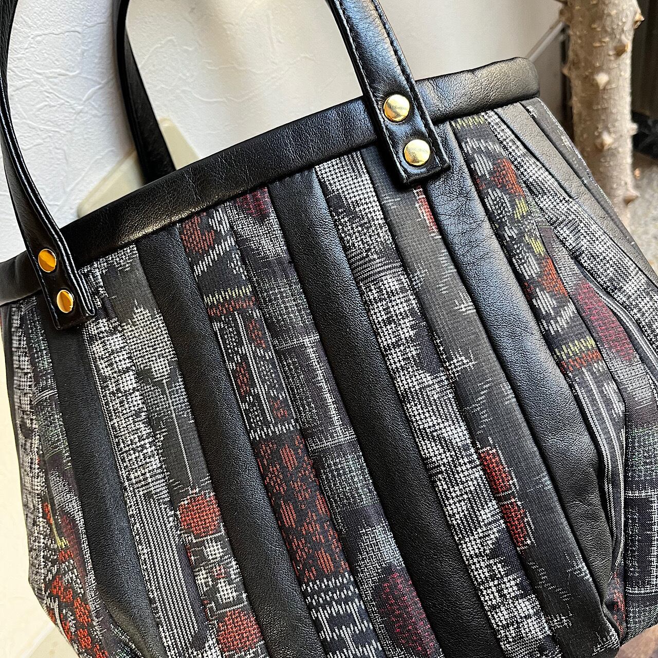 黒の牛革と大島紬などの着物の生地でパッチワークを施して作りました。