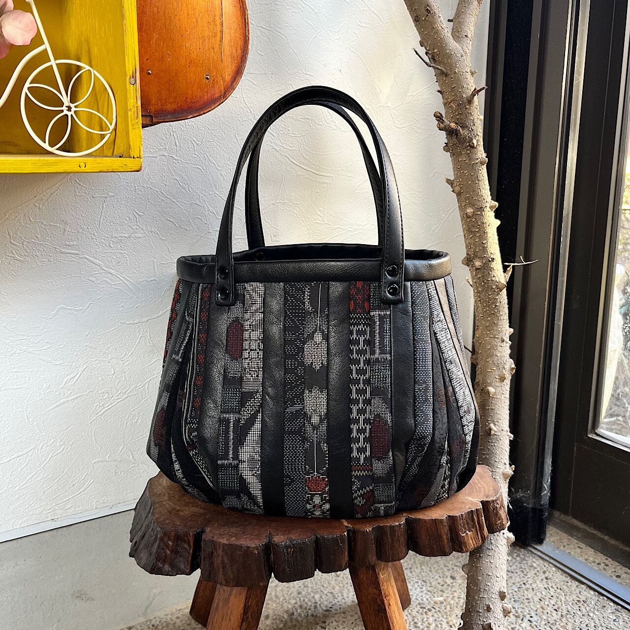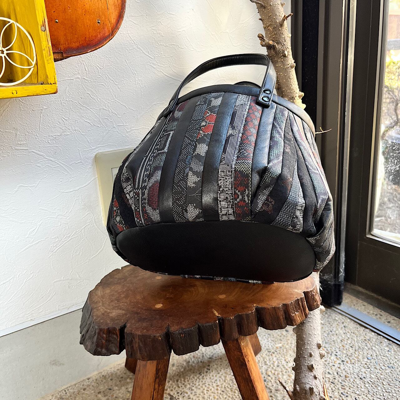 黒の牛革と大島紬などの着物の生地でパッチワークをして作りました。