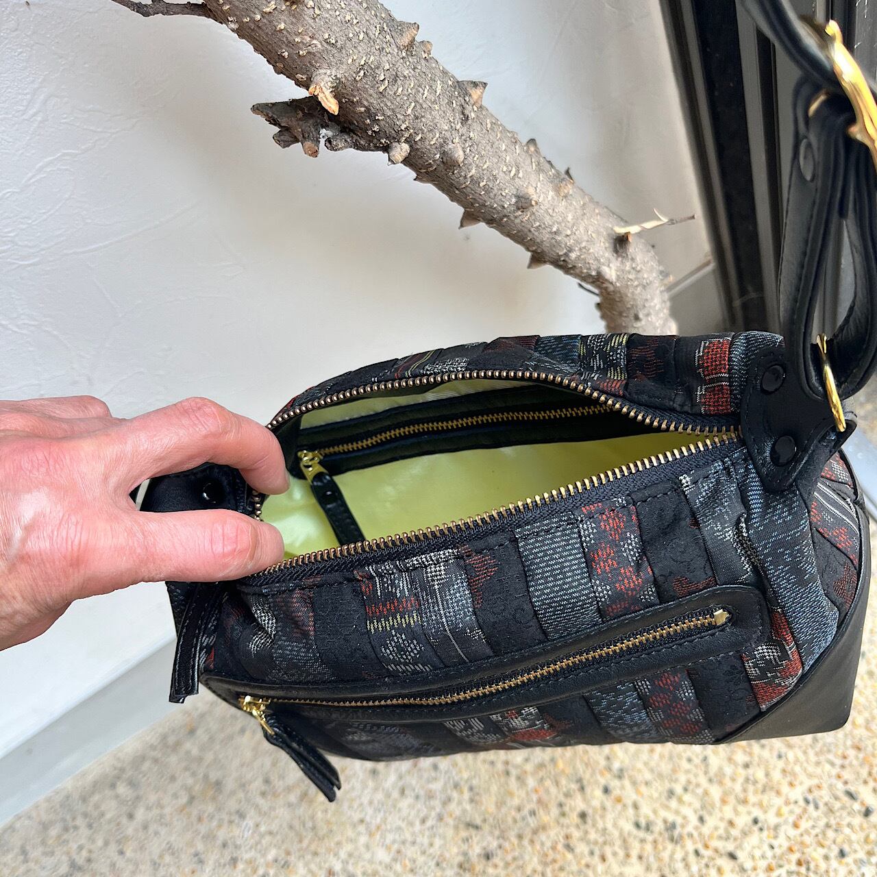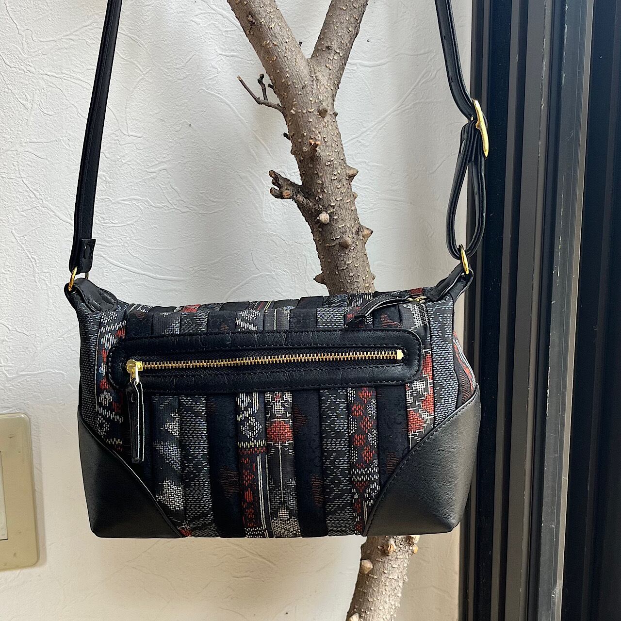 革と古布のパッチワークポシェット(黒系) No.01017-02