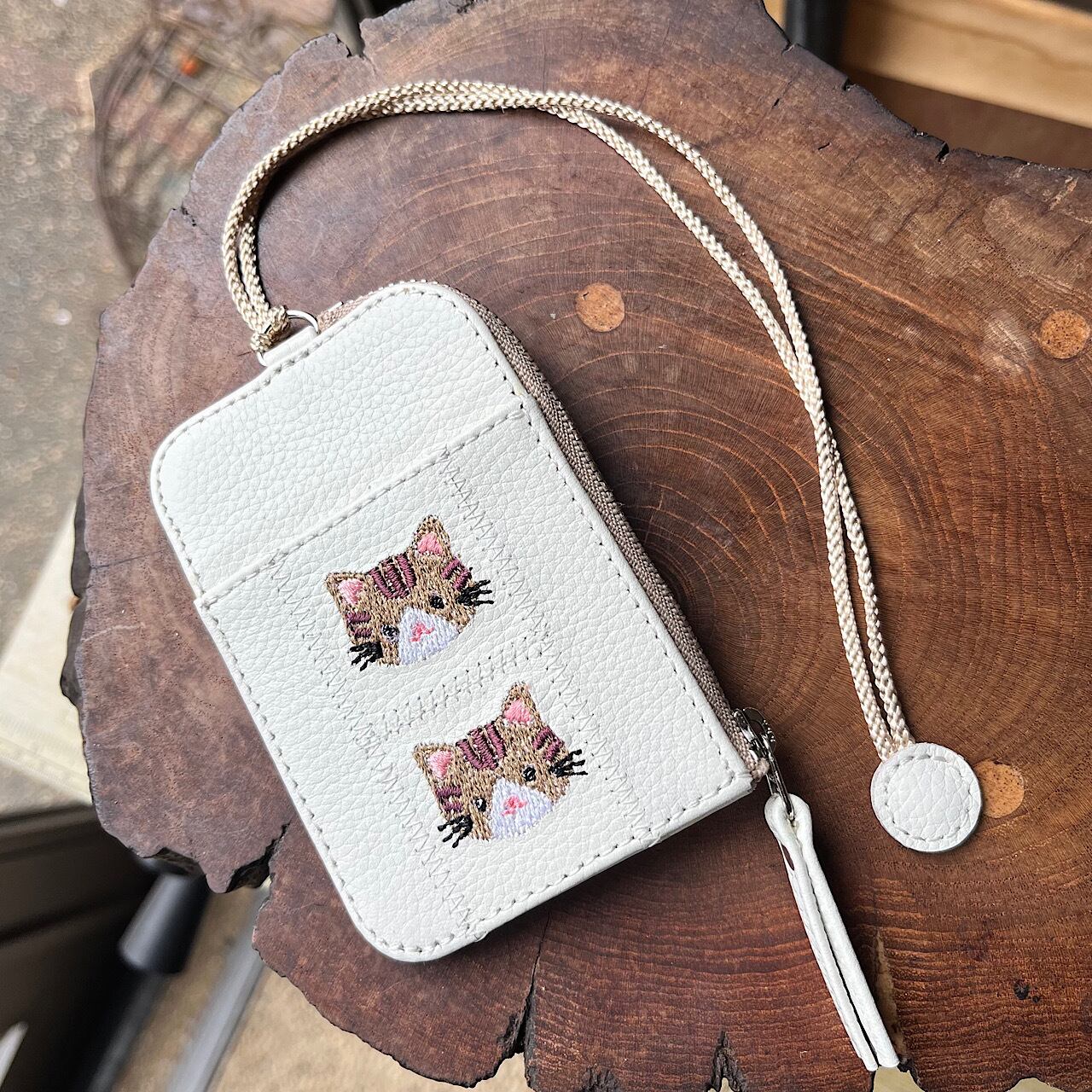 パスケース2枚用 小銭入れ付き(白の革に茶トラ猫の刺繡)No.03003-29
