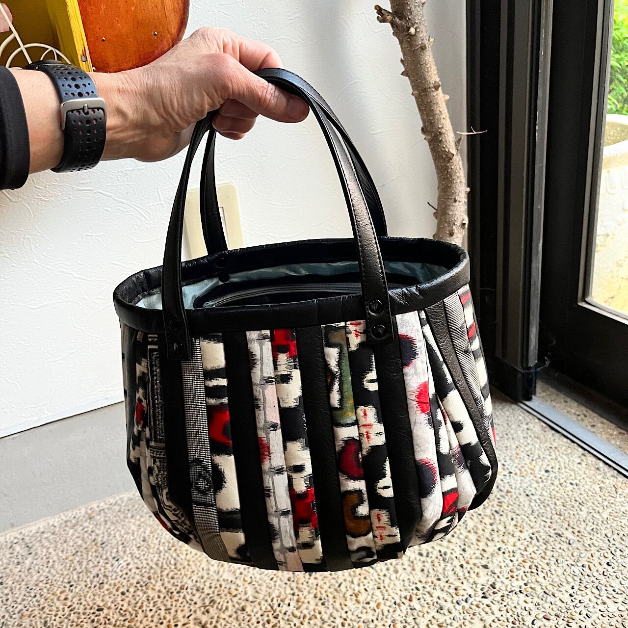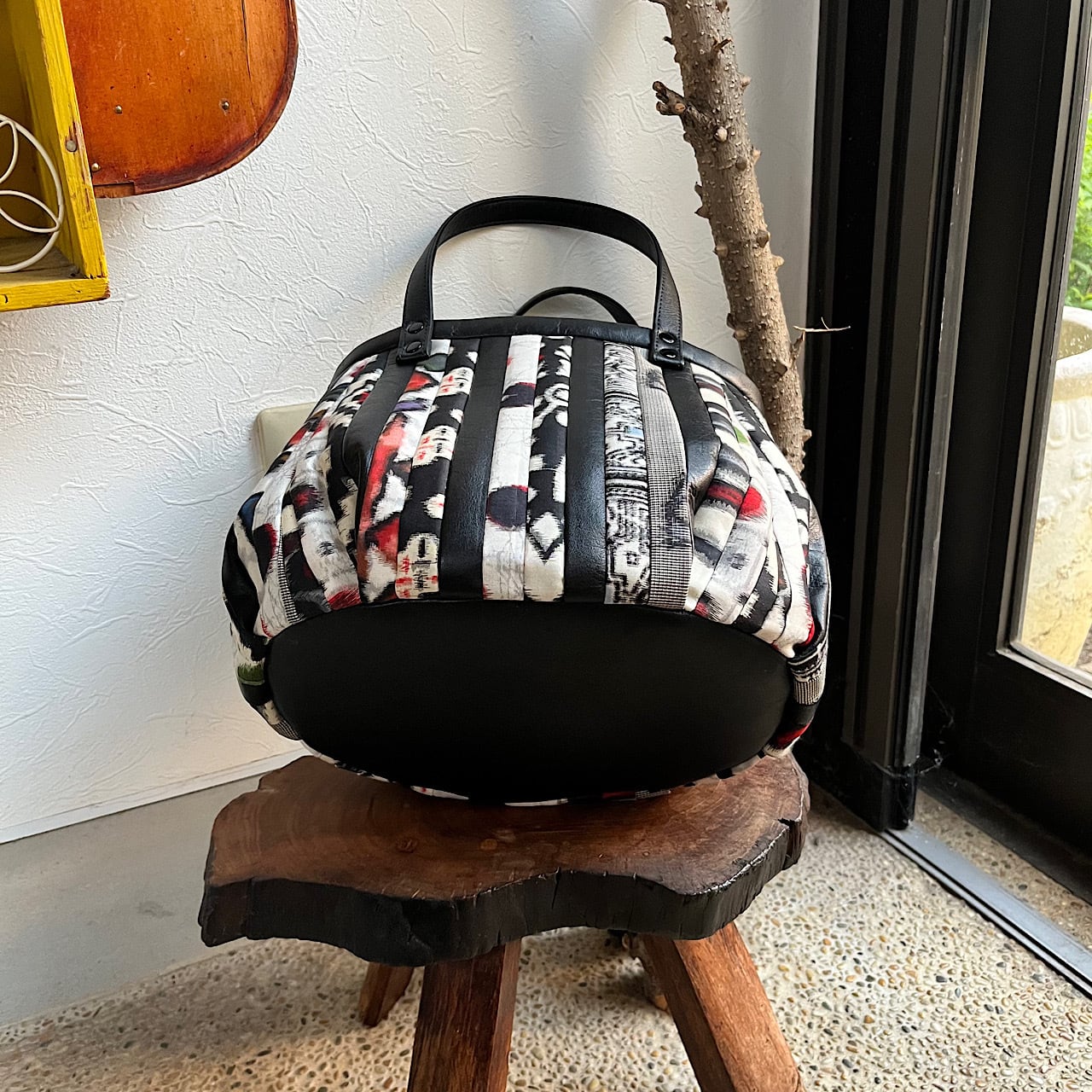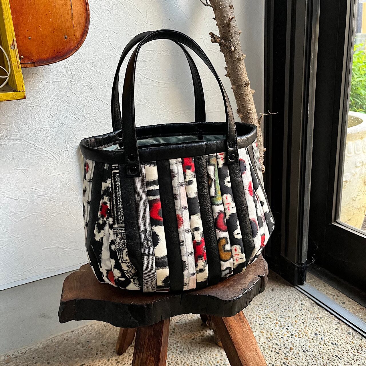 黒の牛革と着物の生地(銘仙)でパッチワークをして作りました。
