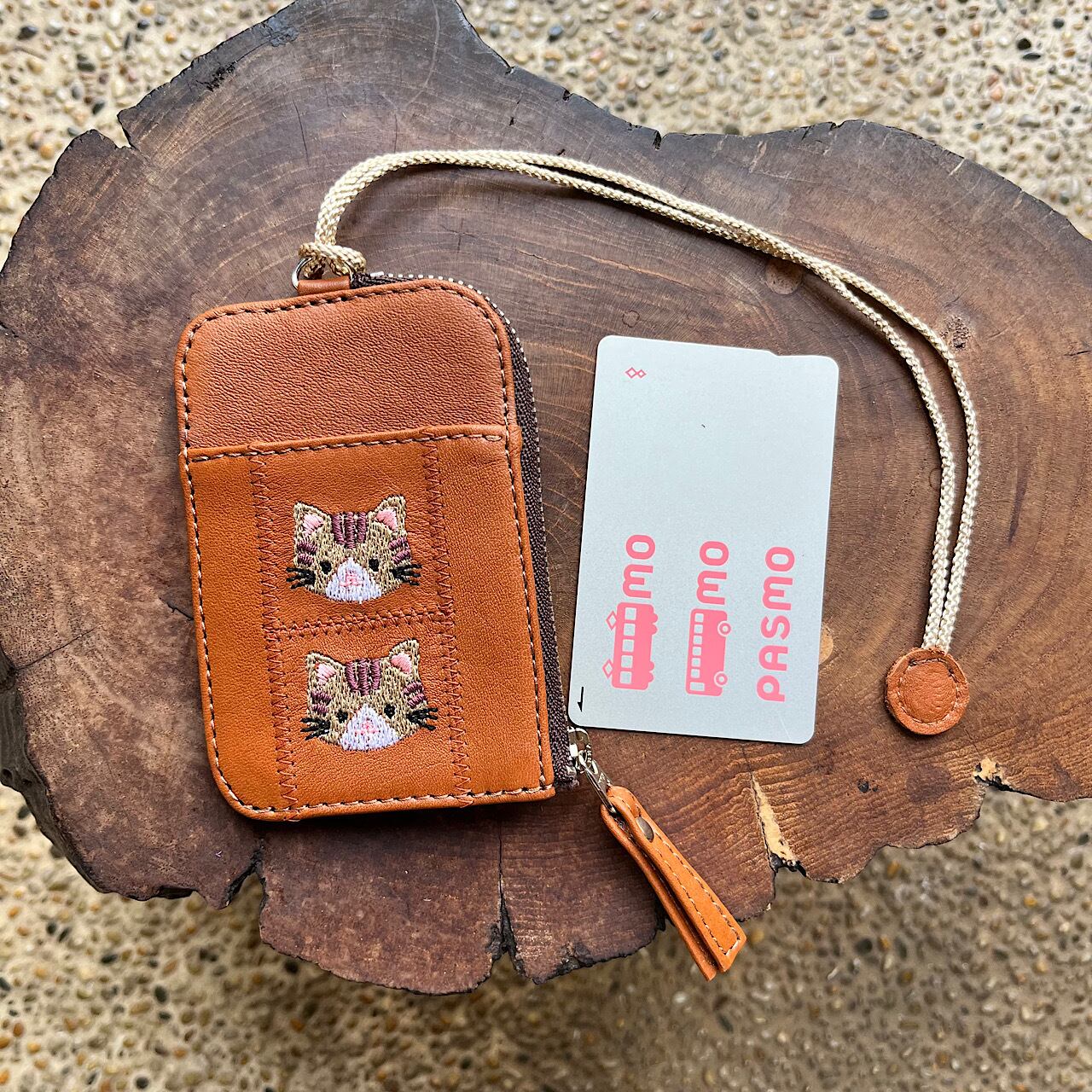 パスケース2枚用 小銭入れ付き(赤茶の革に茶トラ猫の刺繡)No.03003-34