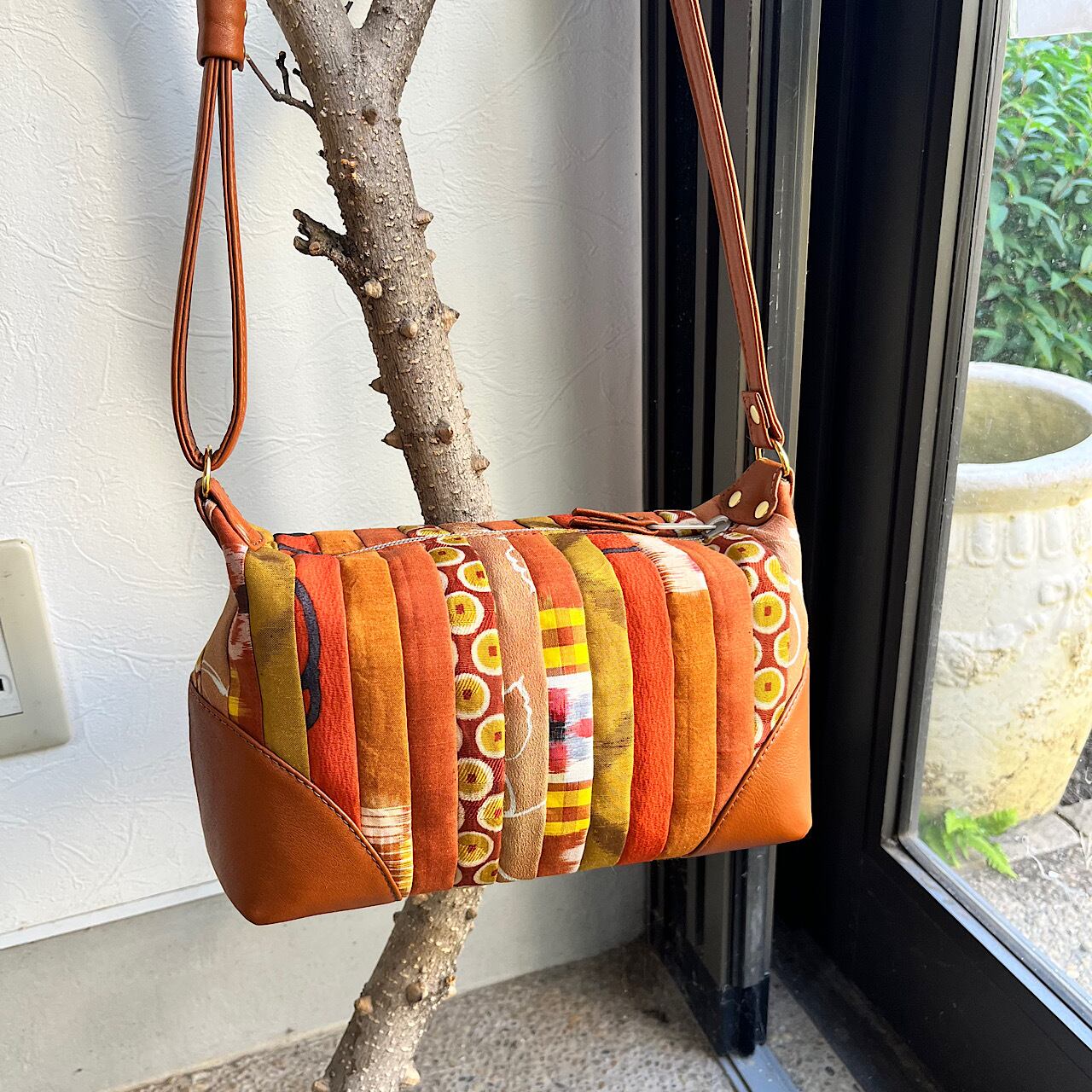 赤茶の牛革と着物を解いた生地でパッチワークをして作りました。