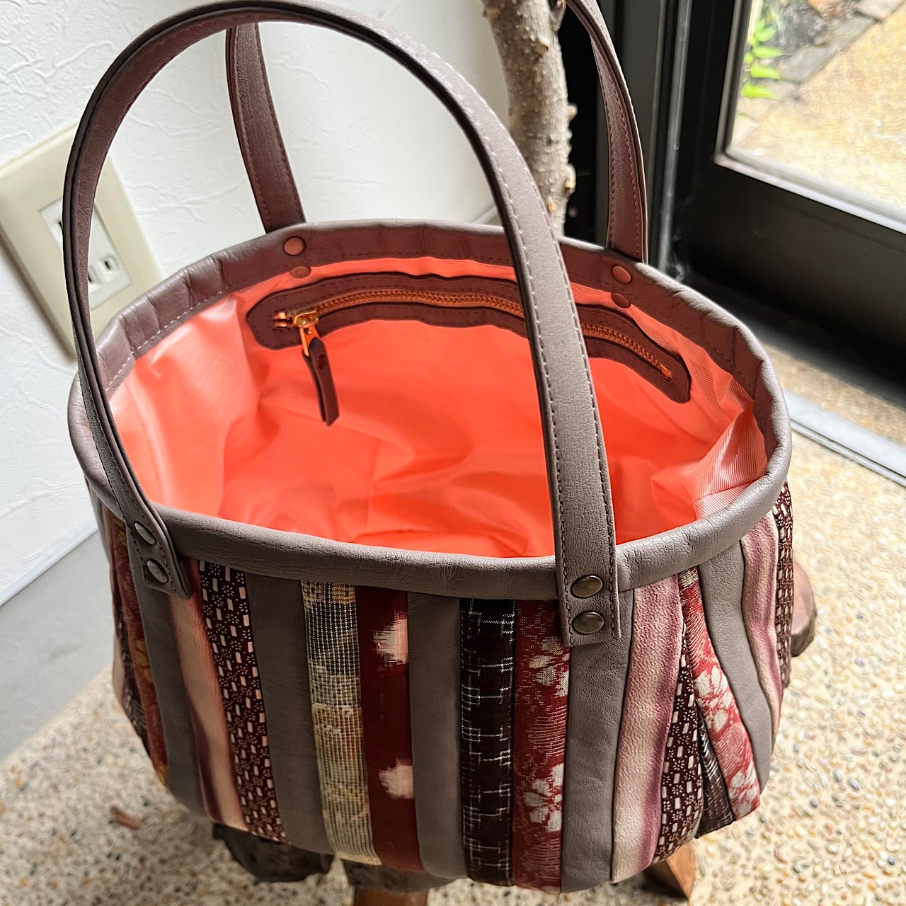 グレーがかったベージュの牛革と着物の生地でパッチワークをして作りました。