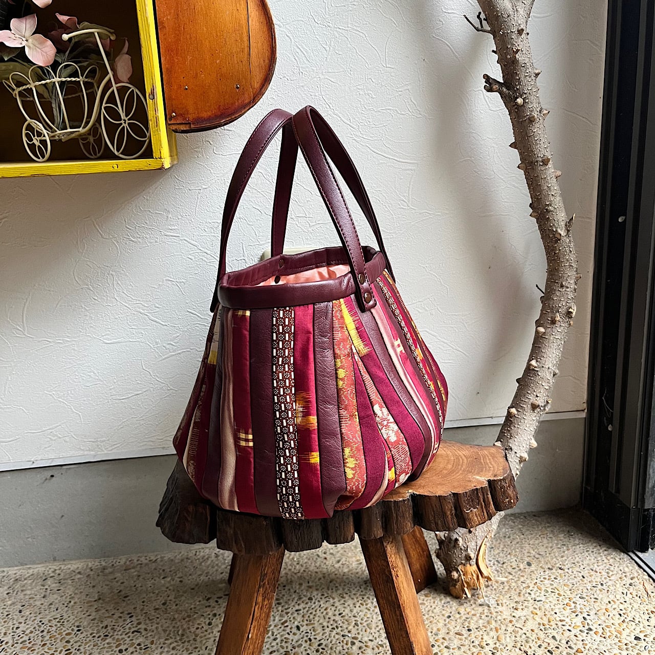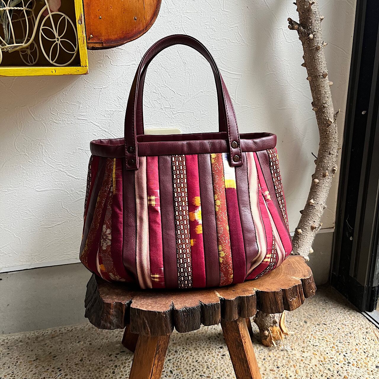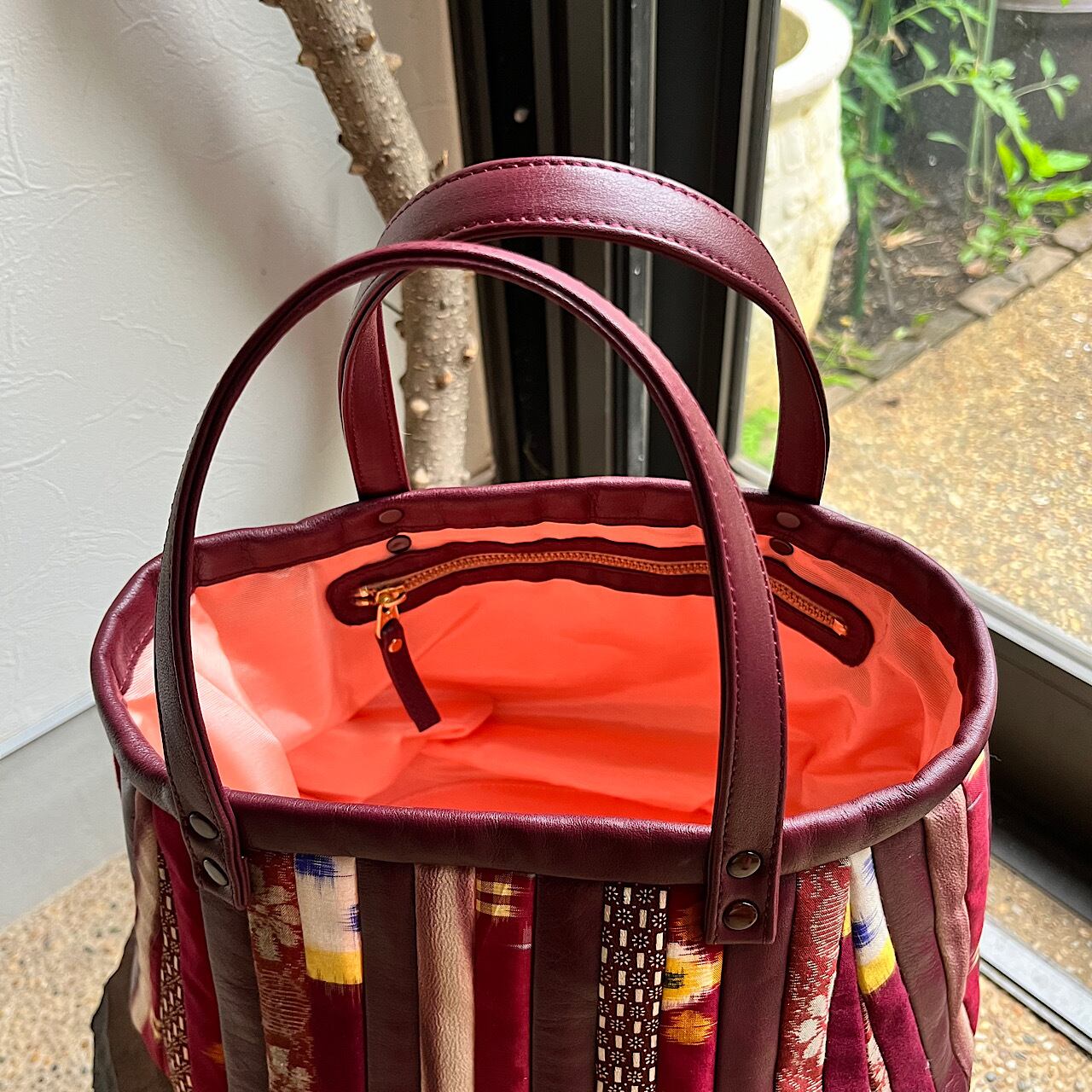 濃いめのエンジ色の牛革と着物の生地でパッチワークをして作りました。