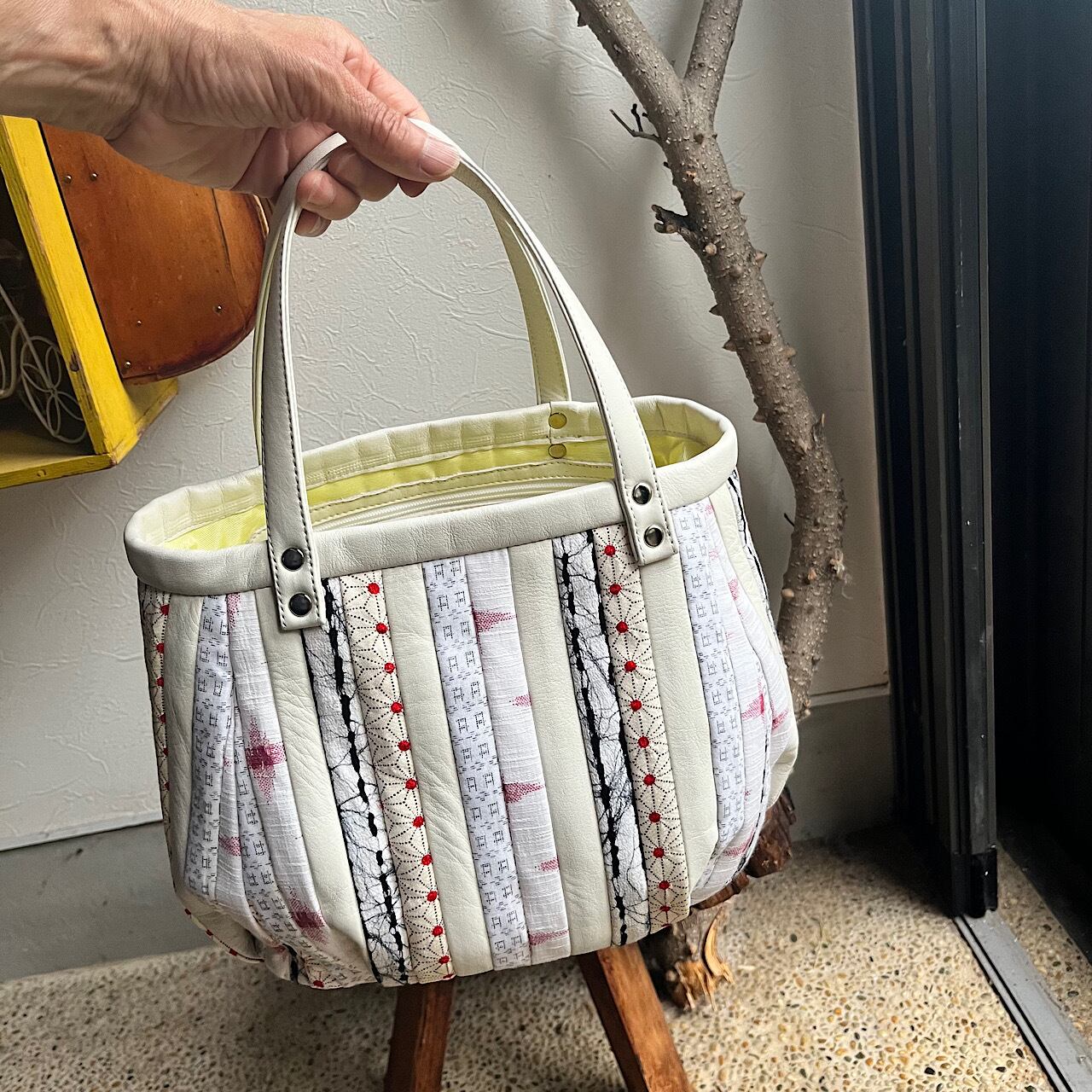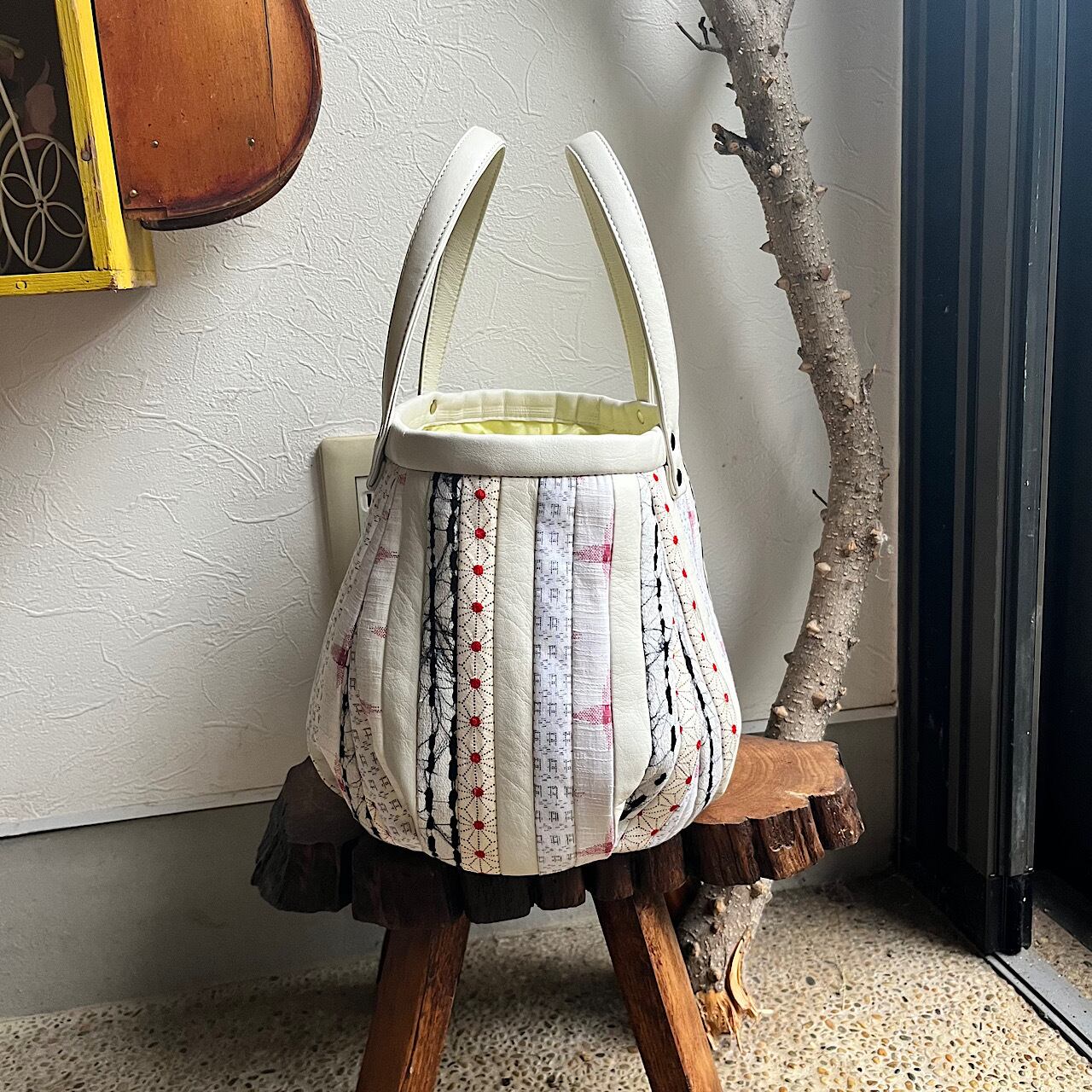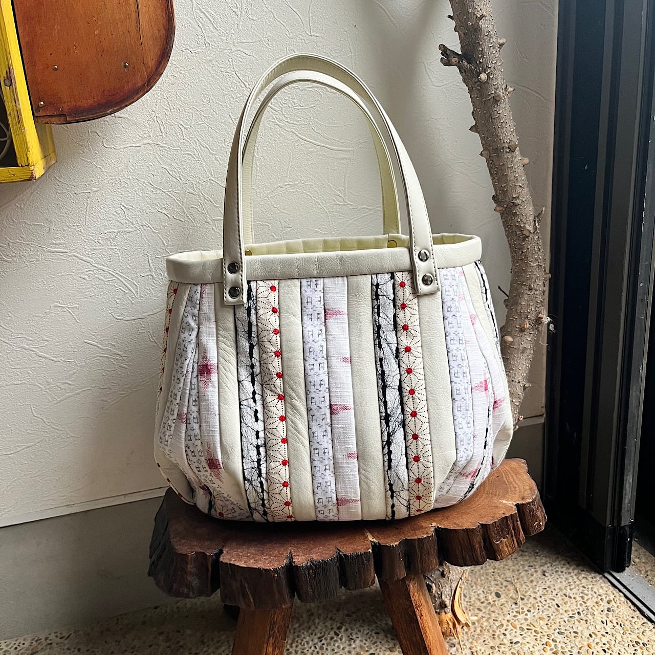 革と古布のパッチワークバッグ(オフホワイトの革+着物生地)No.01016-33