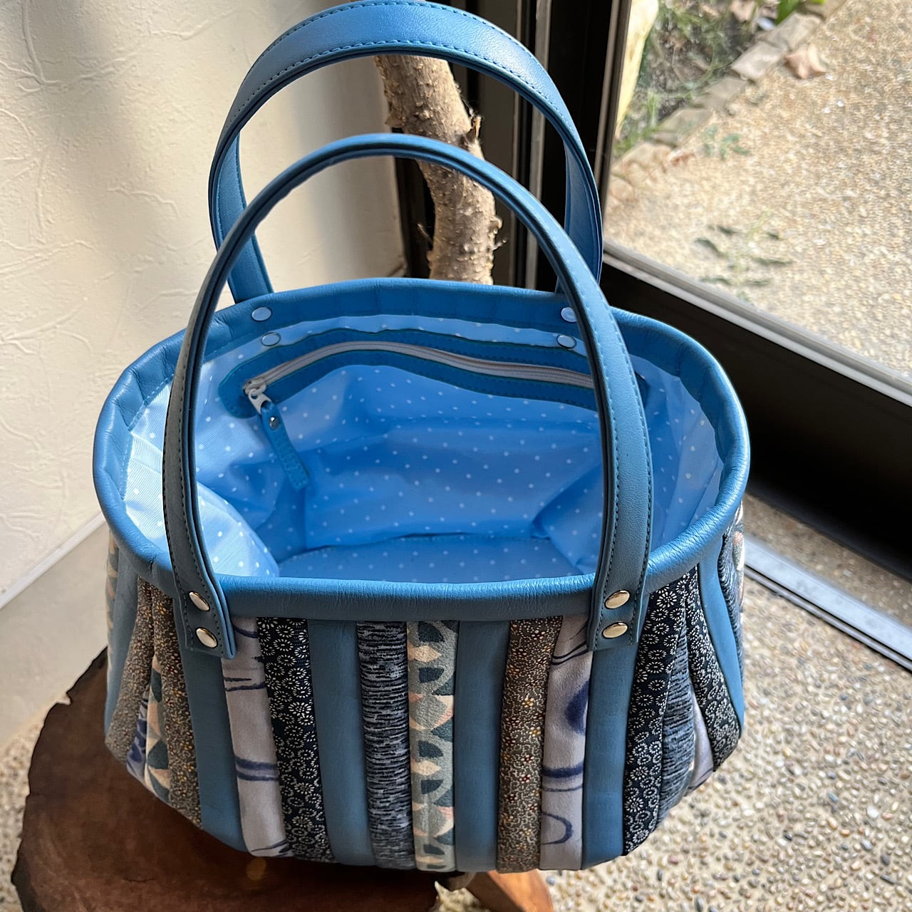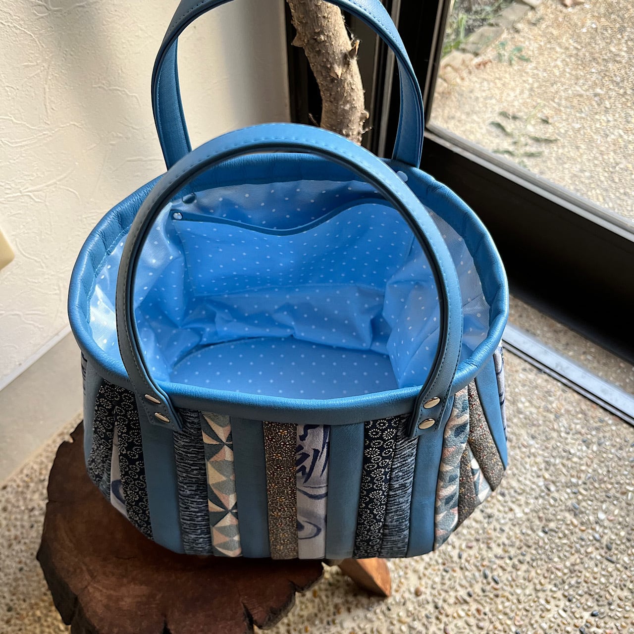 スカイブルー(水色)の牛革と銘仙や小紋などの着物の生地でパッチワークをして作りました。