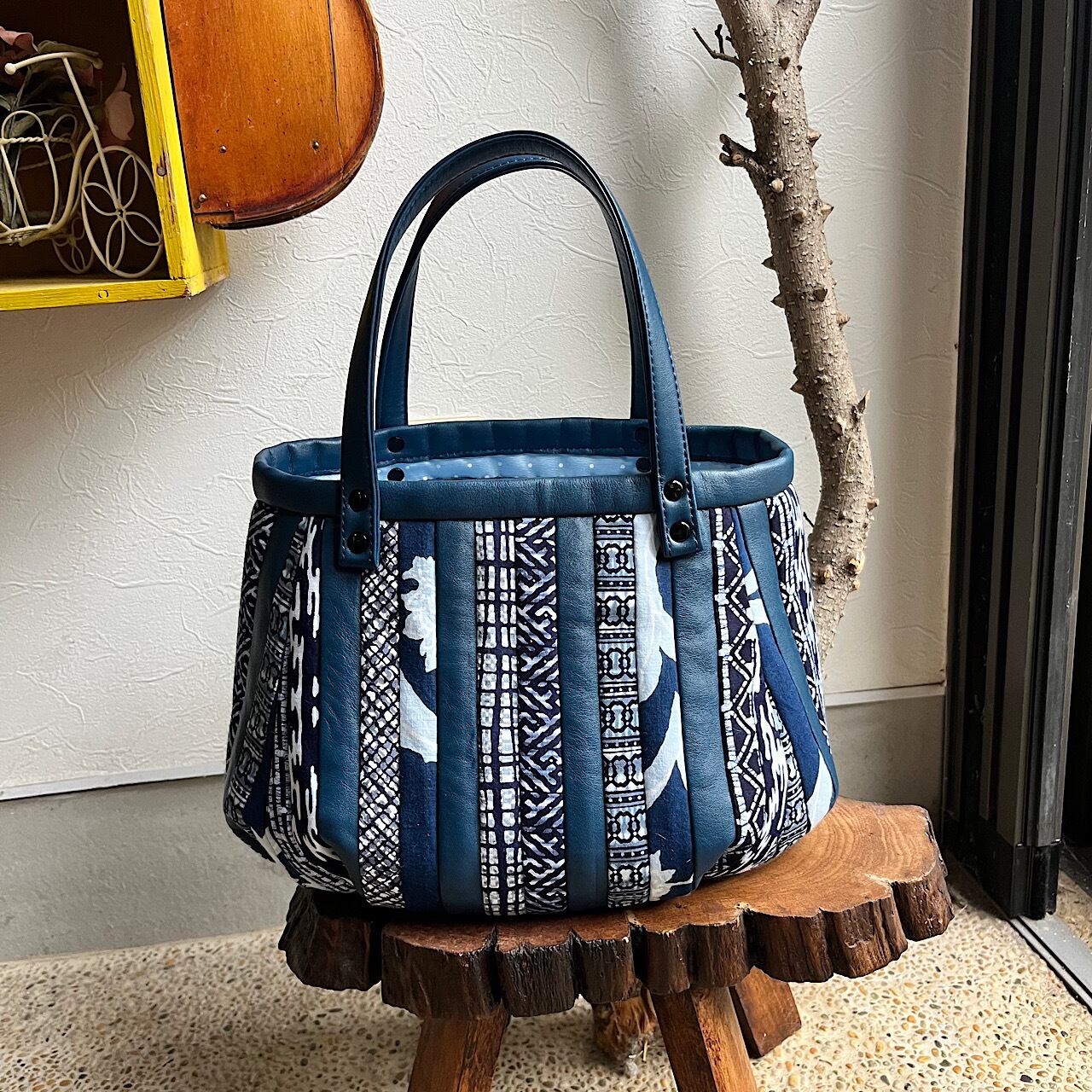 革と古布のパッチワークバッグ(青の革+ゆかた生地)No.01016-39