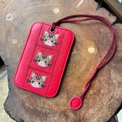 赤の牛革に茶トラ猫の刺繡を施しパッチワークをして作りました。
