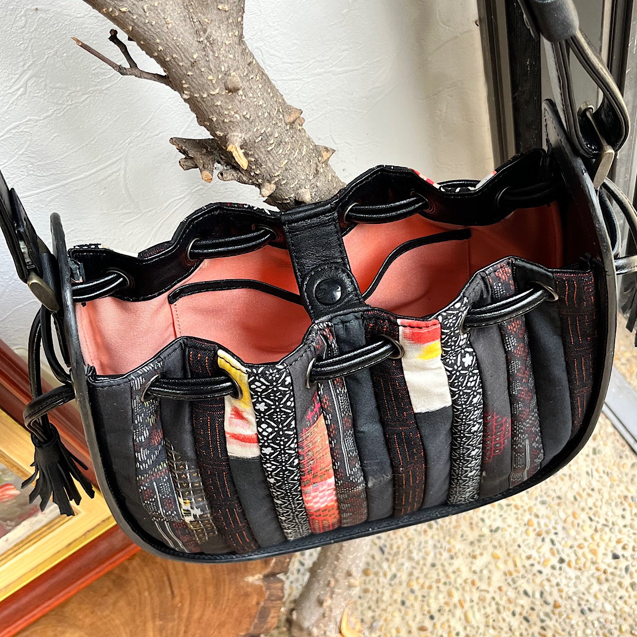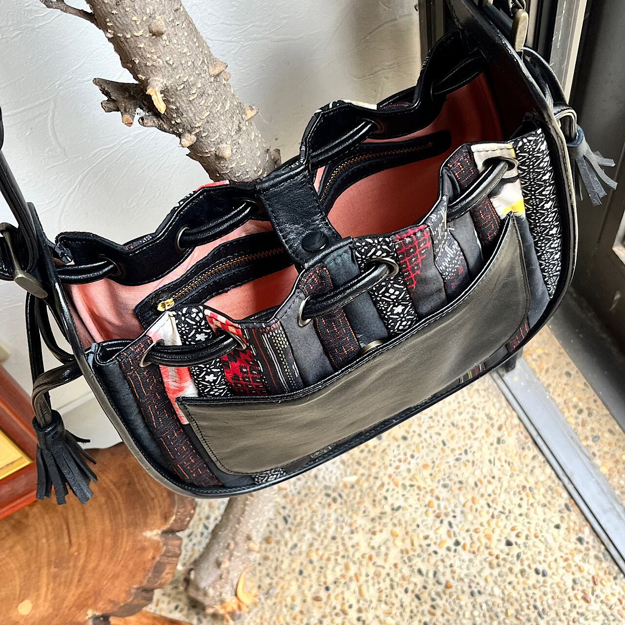 黒茶のヌメ革、クローム革と着物を解いた生地のパッチワークを組ませてショルダーバッグを作りました。
