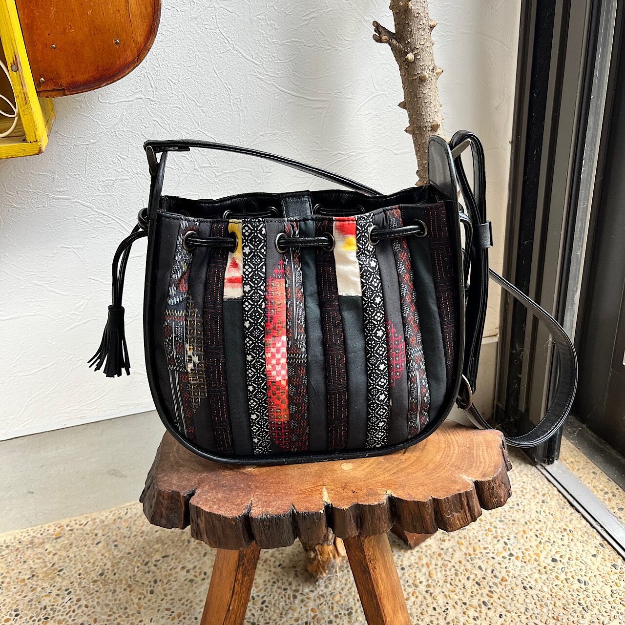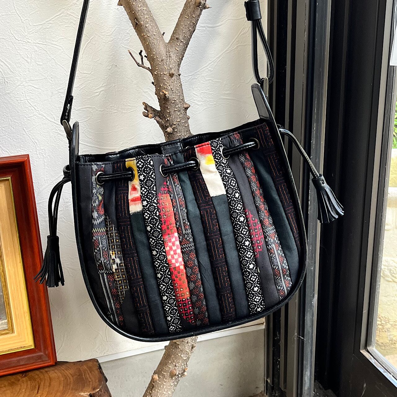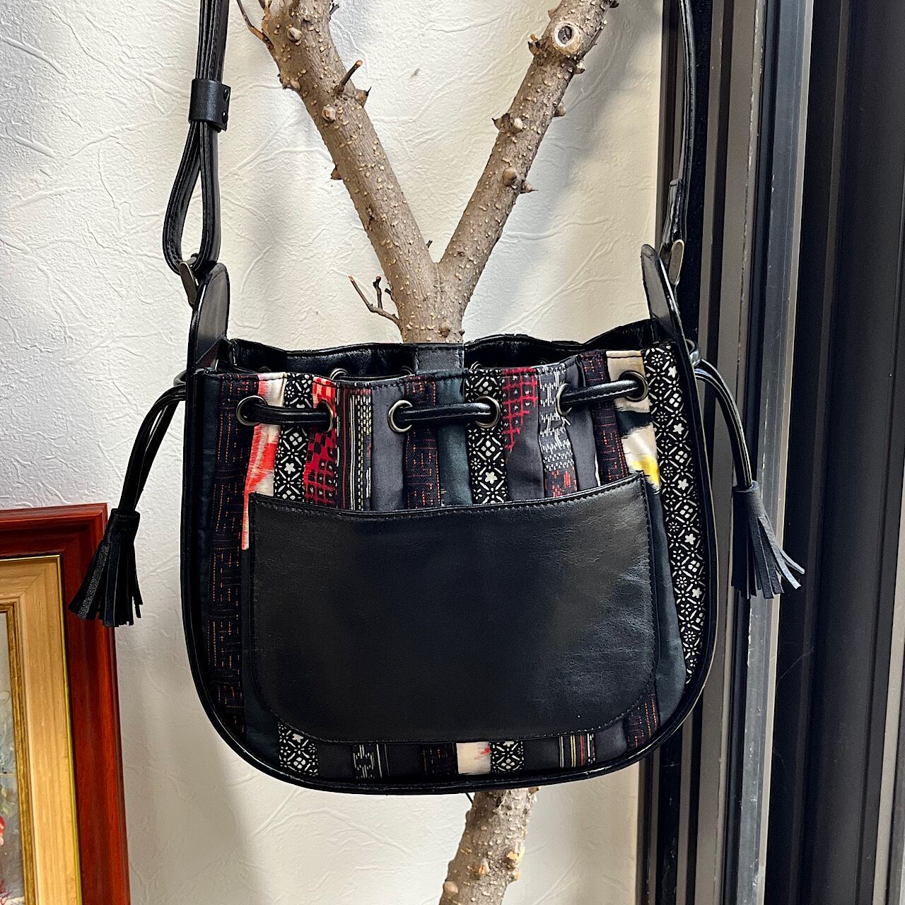 革と古布のパッチワーク オーバルショルダー(黒系) No.01019-02