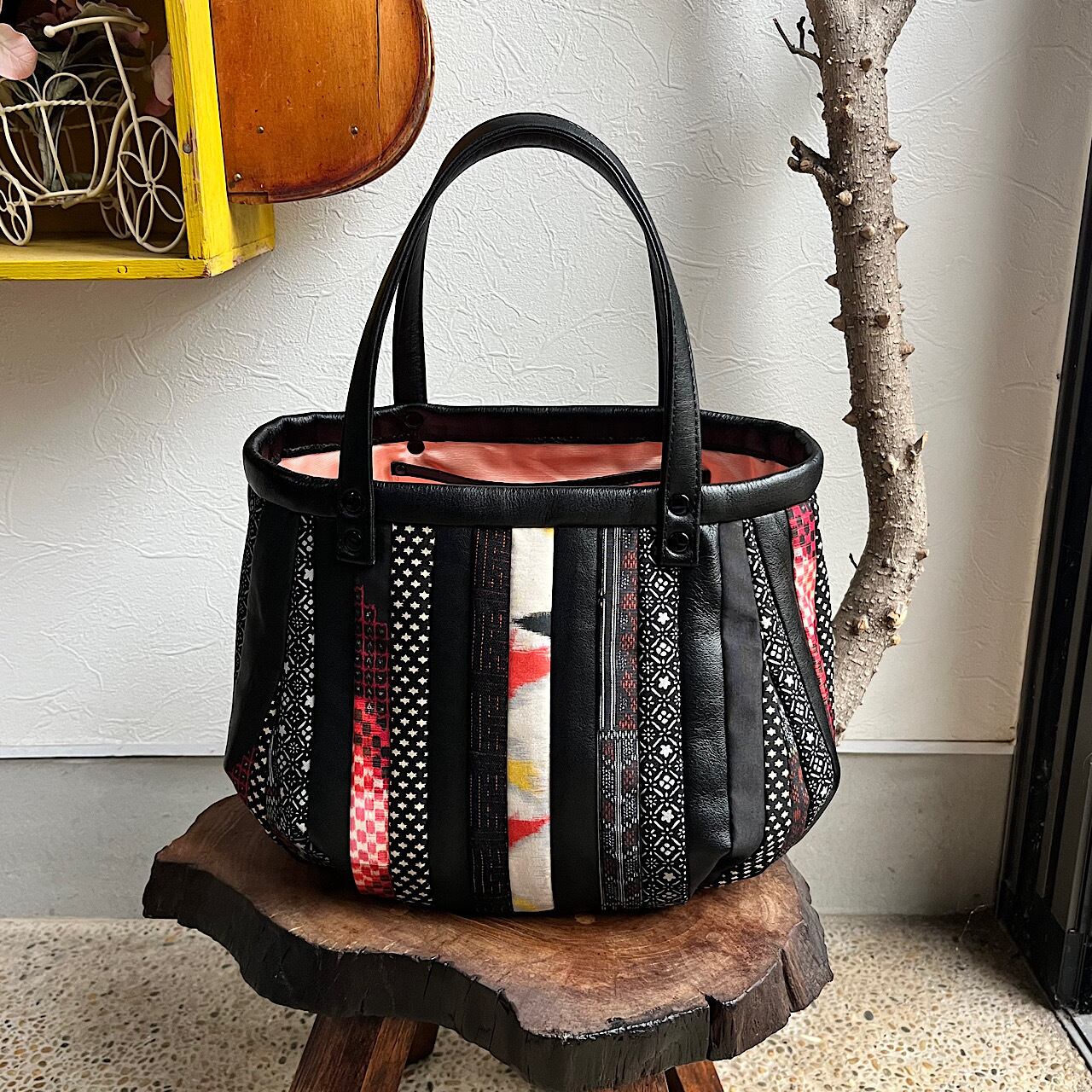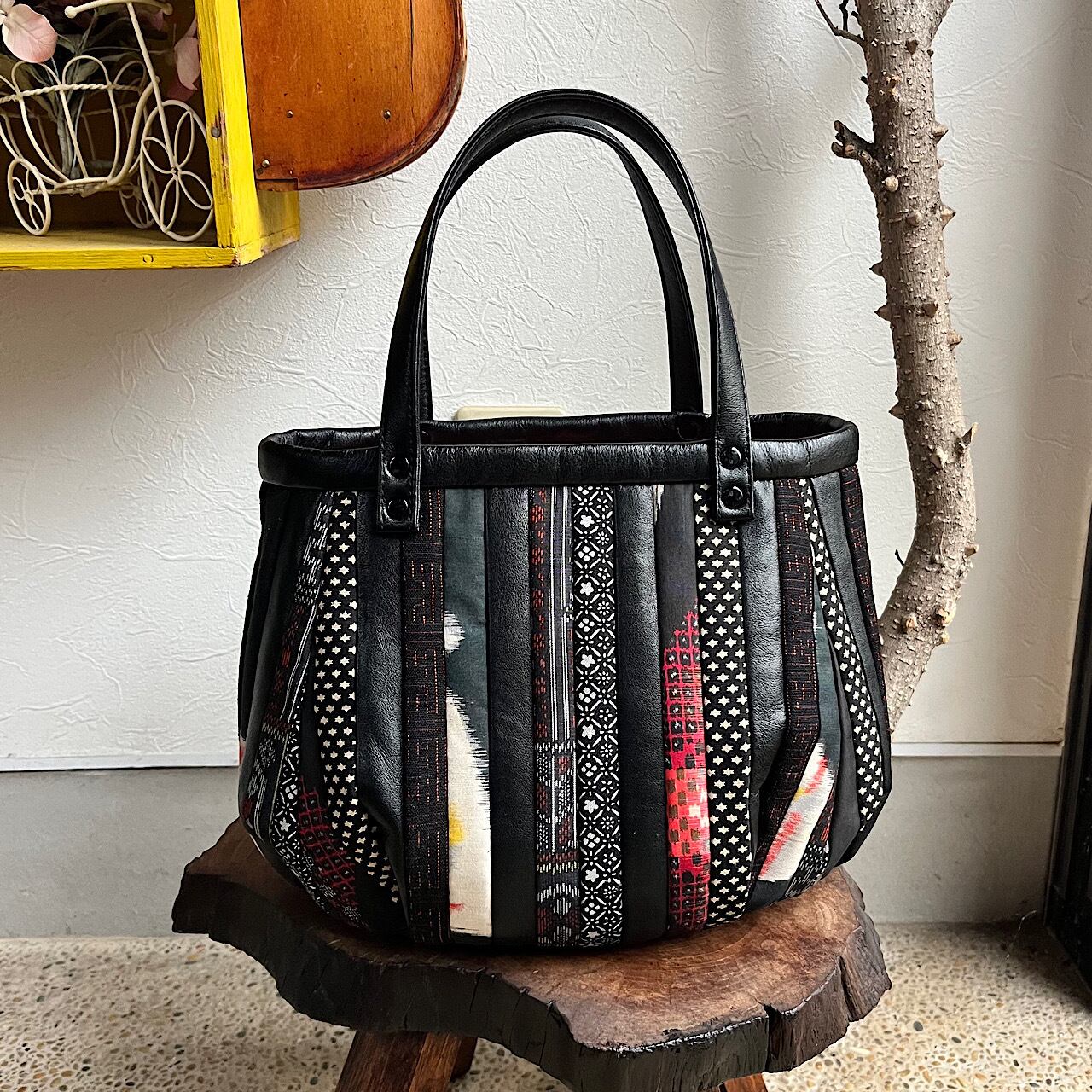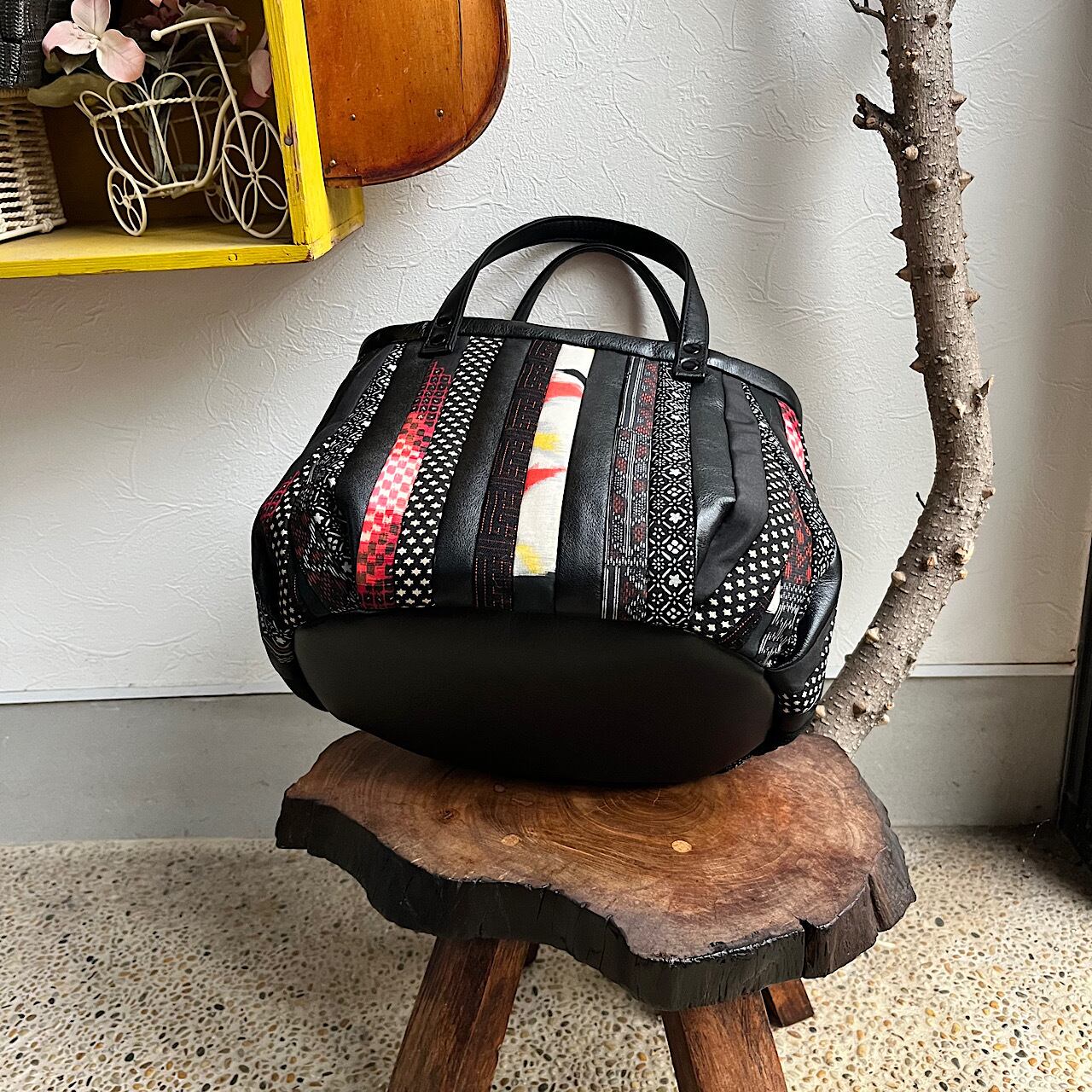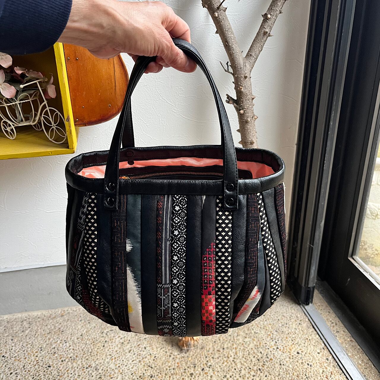 黒の牛革と紬や銘仙などの着物の生地(古布)でパッチワークをして作りました。