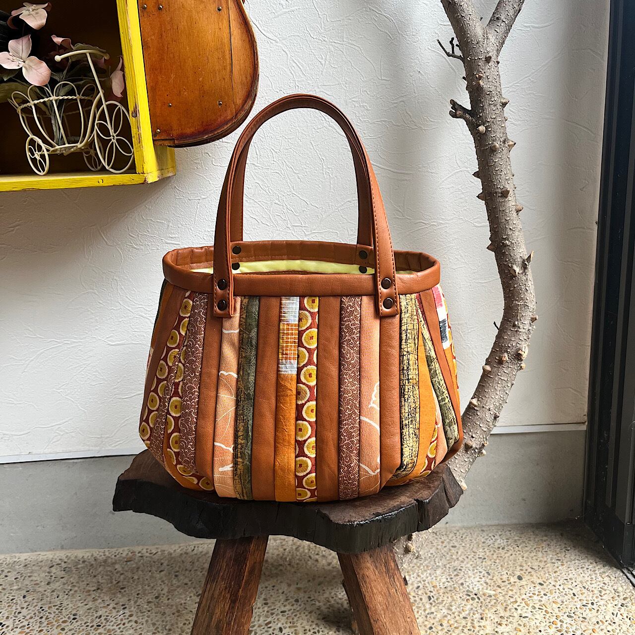 革と古布のパッチワークバッグ(赤茶の革+着物生地)No.01016-50