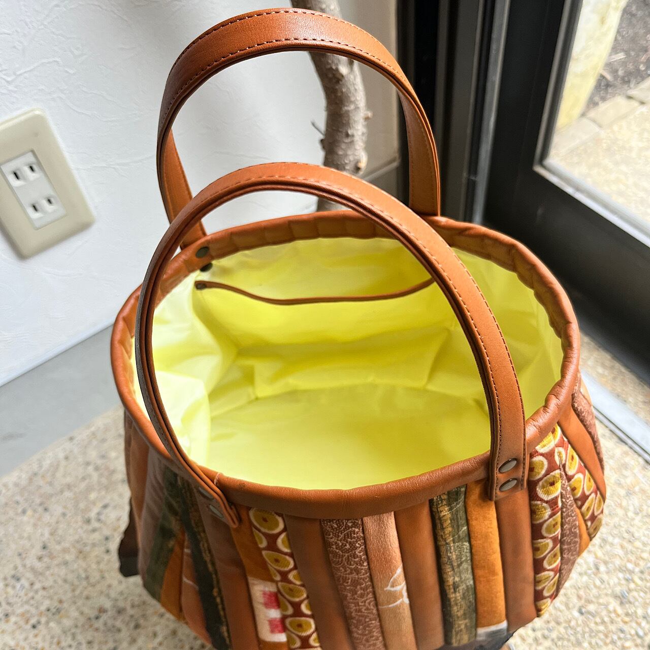 赤茶の牛革と紬や銘仙などの着物の生地(古布)でパッチワークをして作りました。
