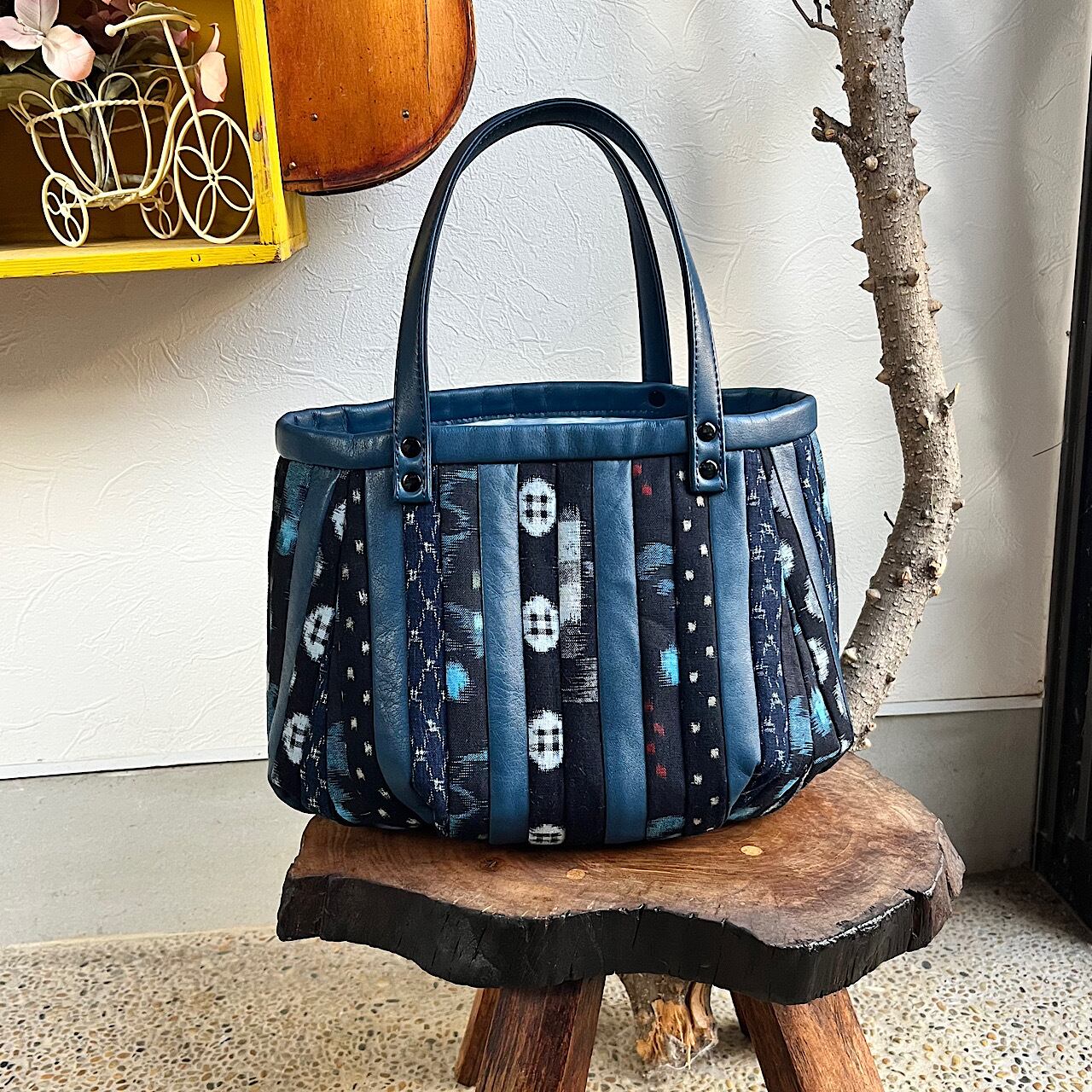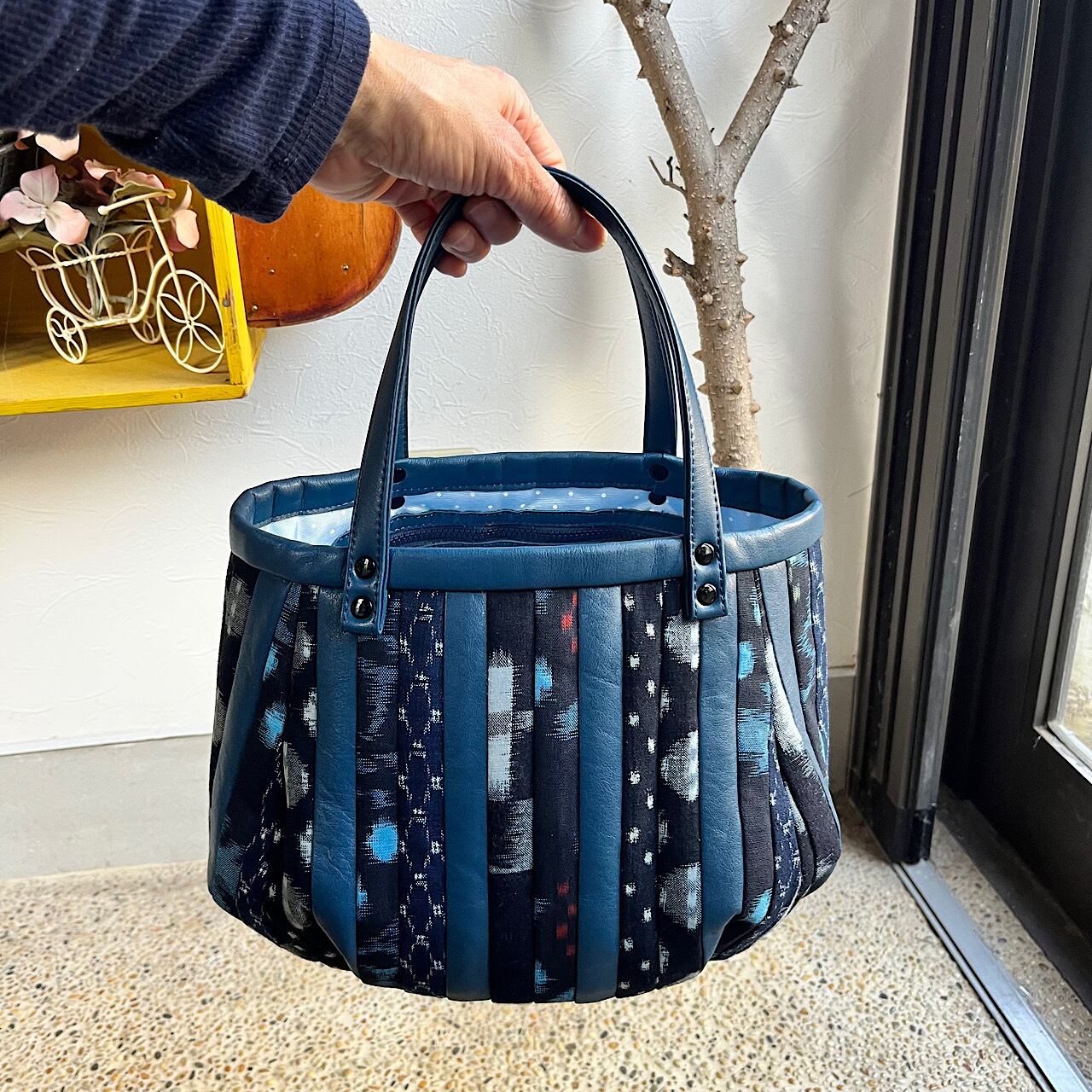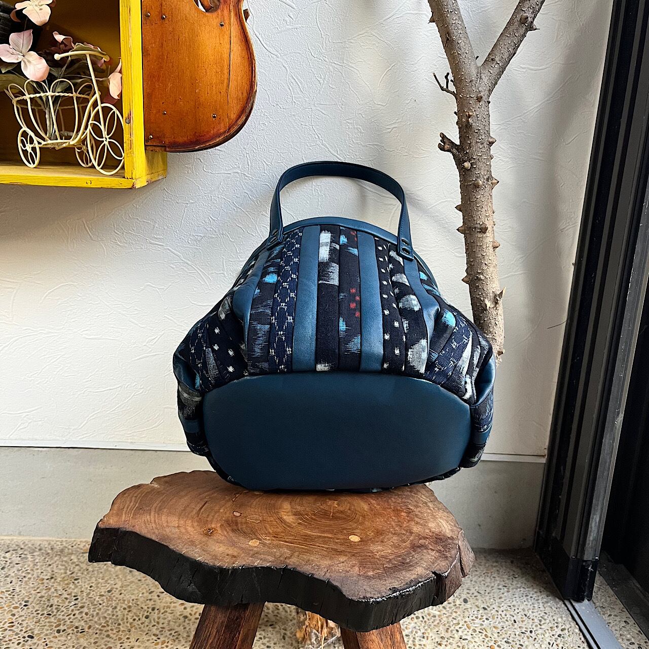 革と古布のパッチワークバッグ(ブルーの革+久留米絣)No.01016-52
