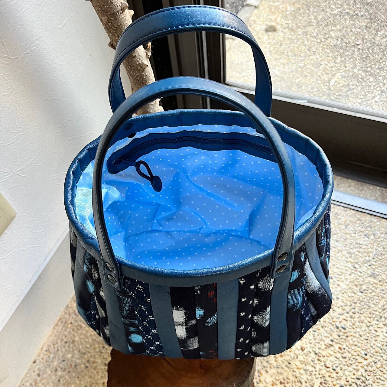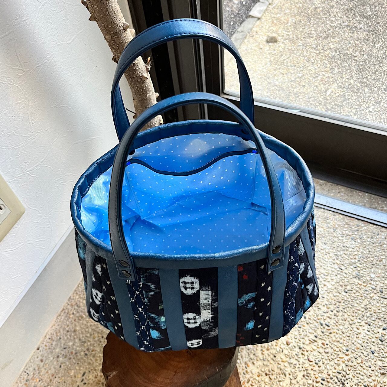 ブルーの牛革と久留米絣の生地(古布)でパッチワークをして作りました。