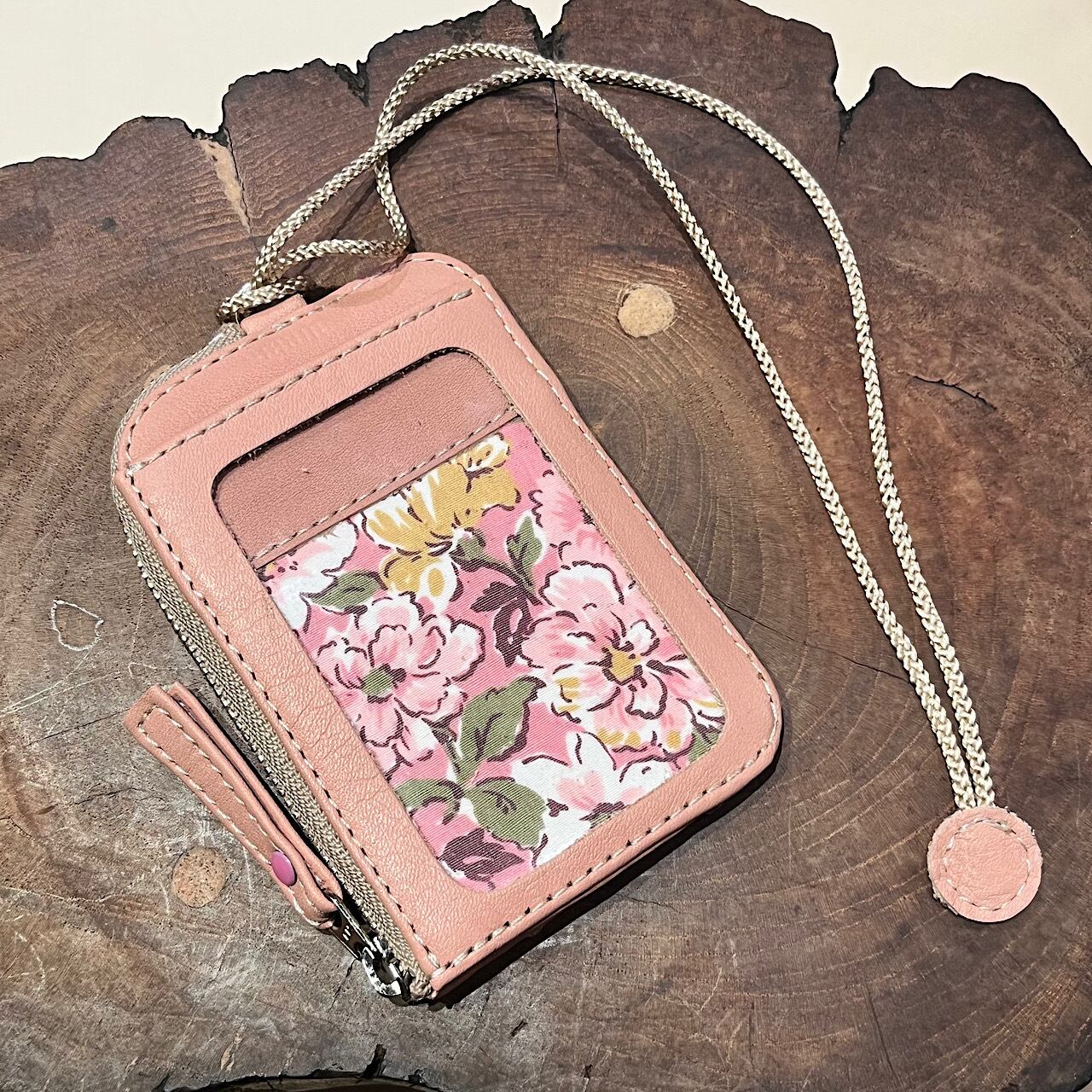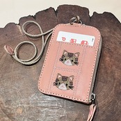 パスケース2枚用 小銭入れ付き(ピンクの革に茶トラ猫の刺繡)No.03003-36
