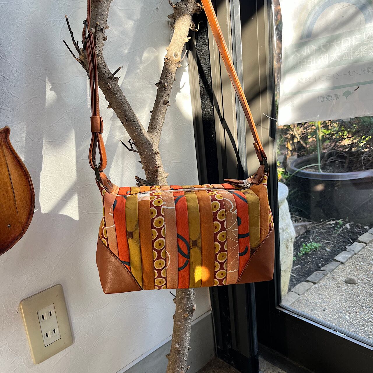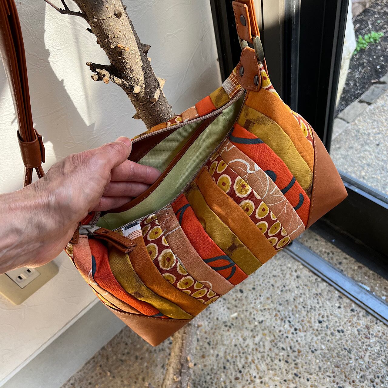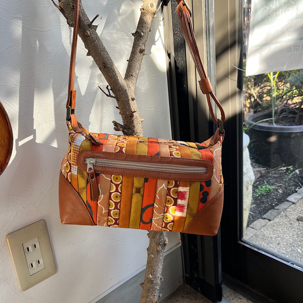 赤茶(キャメル色)の牛革と着物を解いた生地でパッチワークをして作りました。