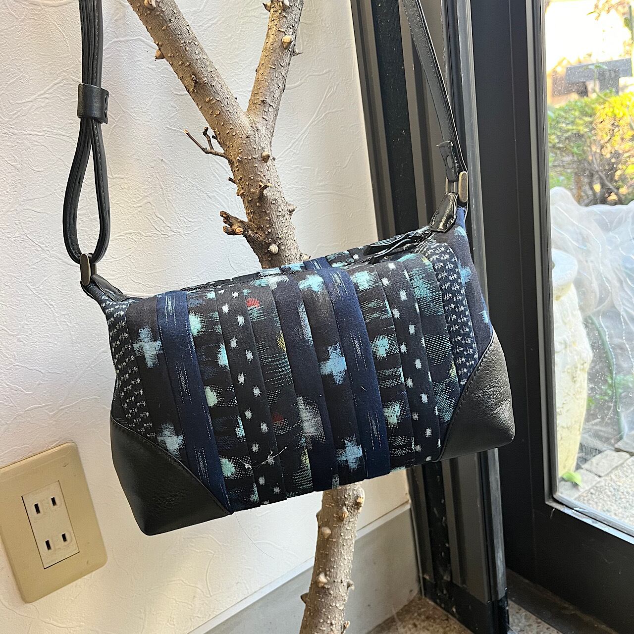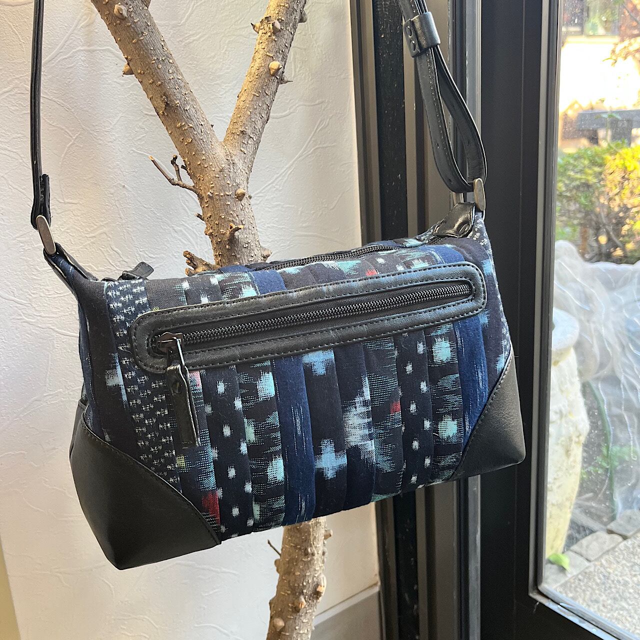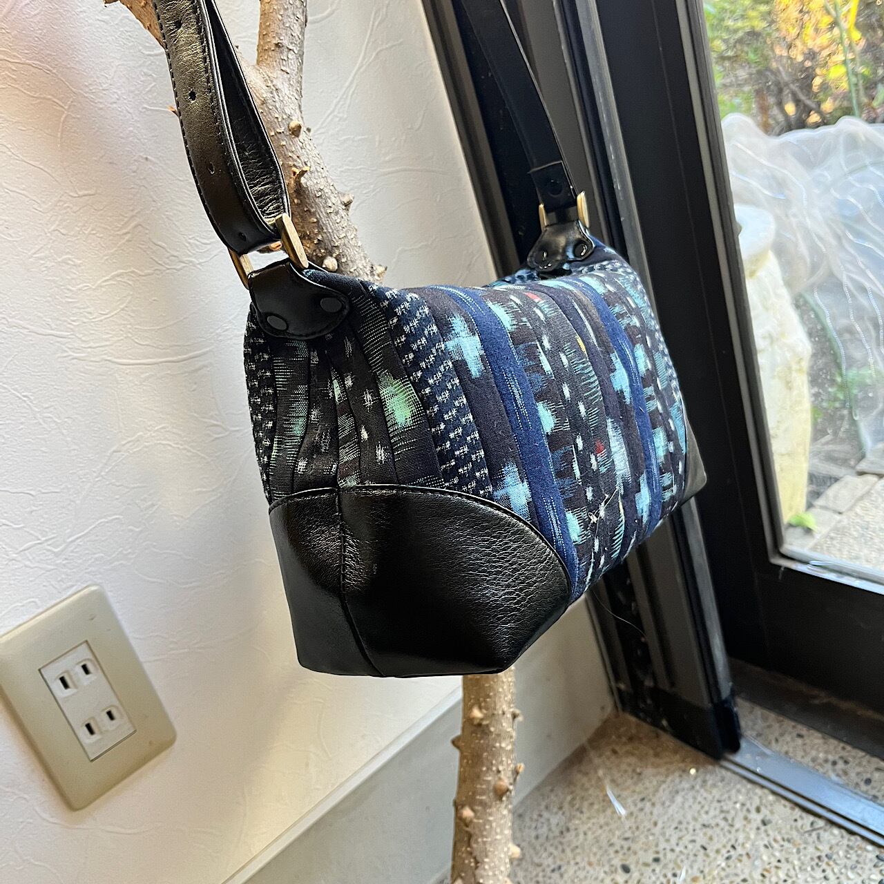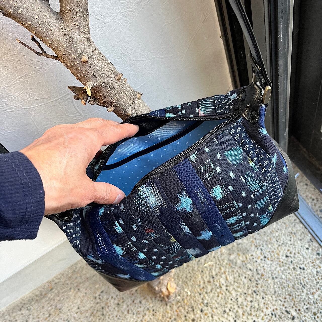 黒の牛革と久留米絣などの着物地(古布)で作りました。