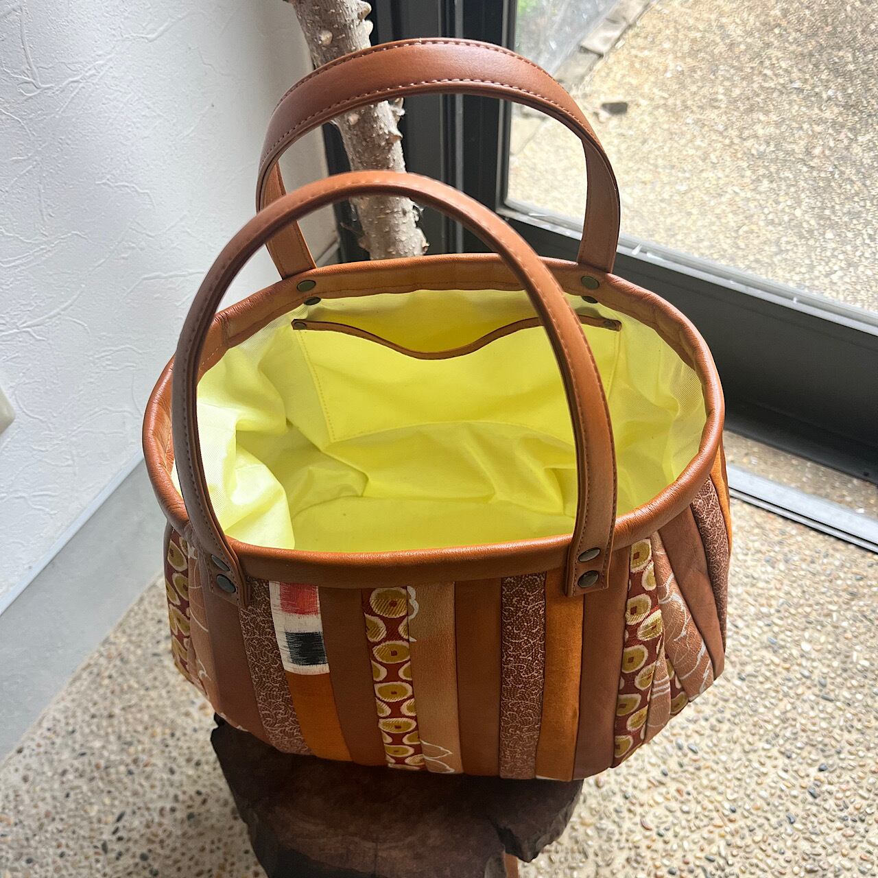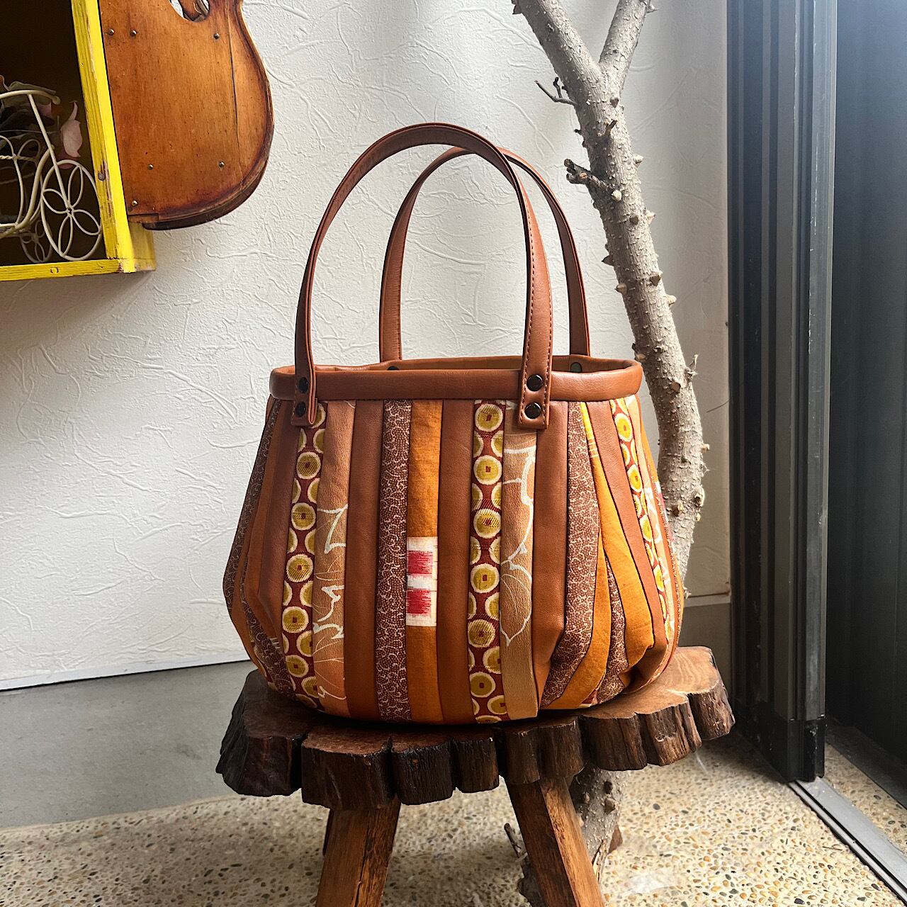 赤茶の牛革と着物の生地(古布)でパッチワークをして作りました。