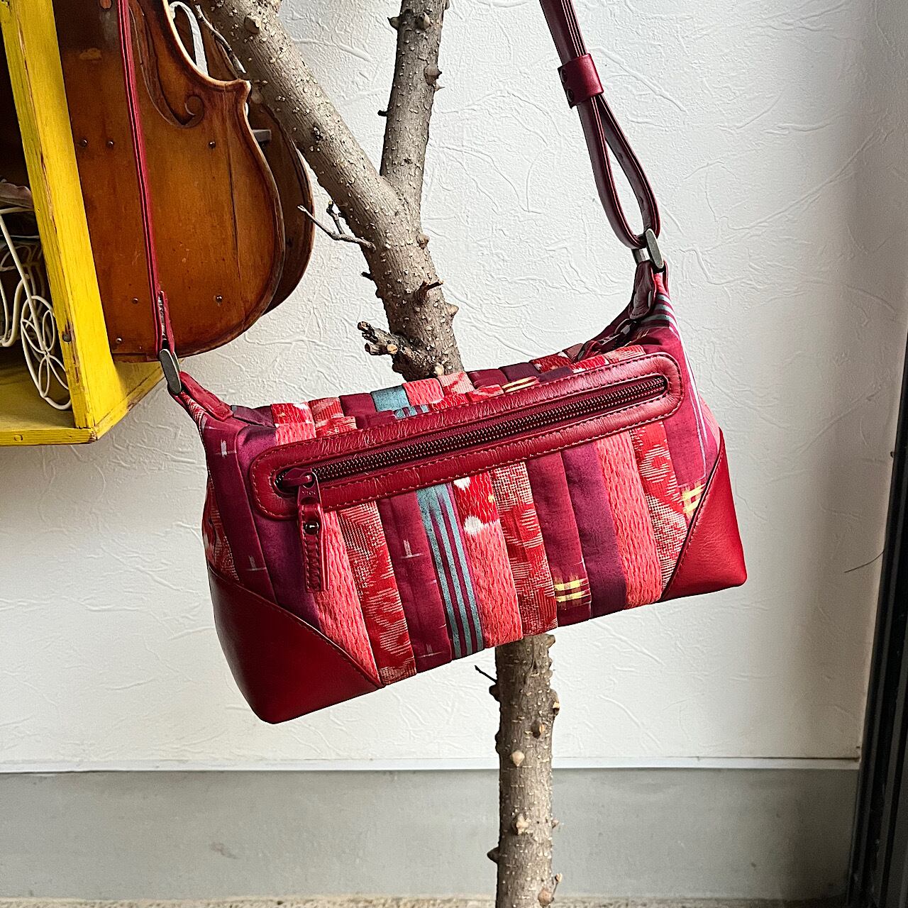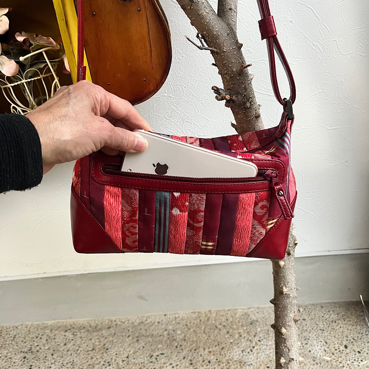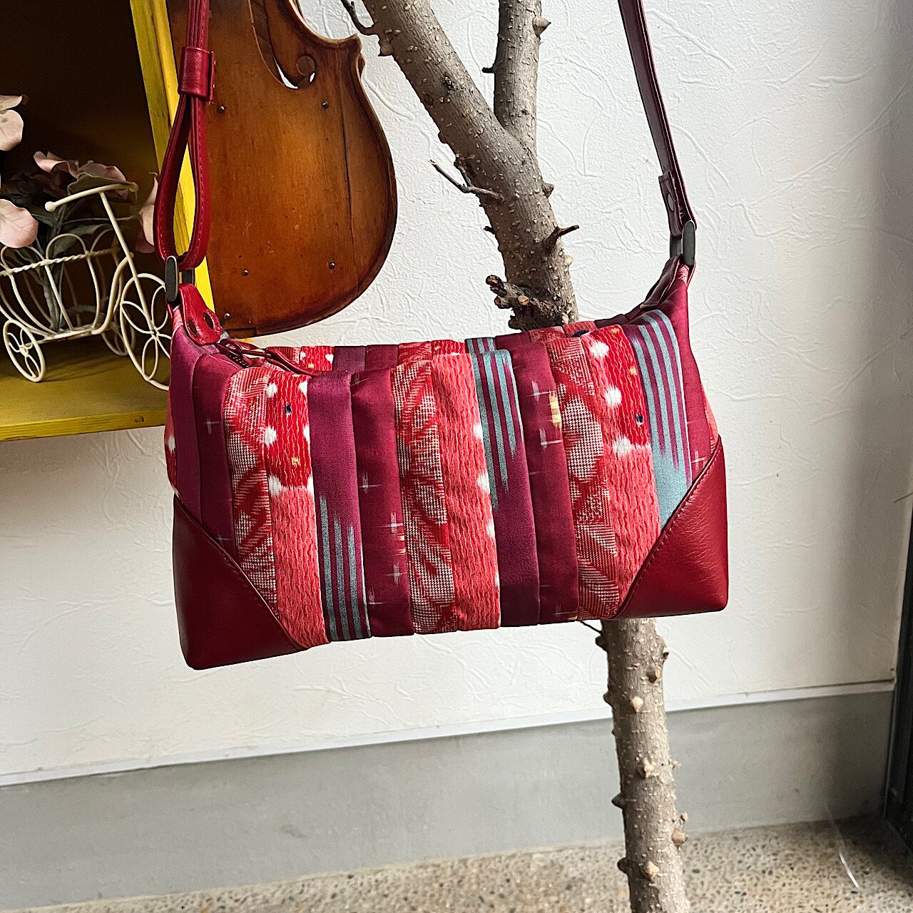 革と古布のパッチワークミニショルダー(ワインレッドの革+着物生地) No.01018-05