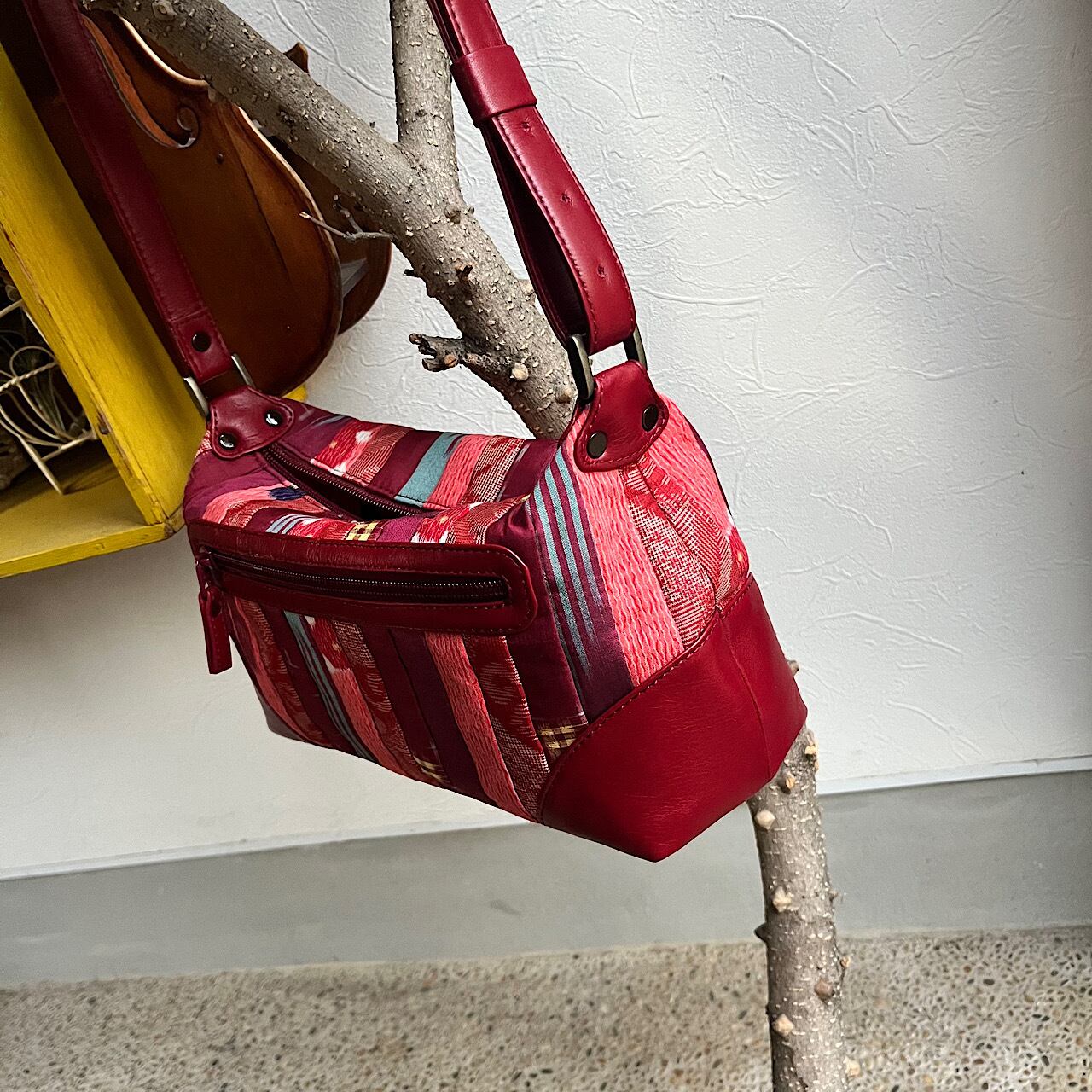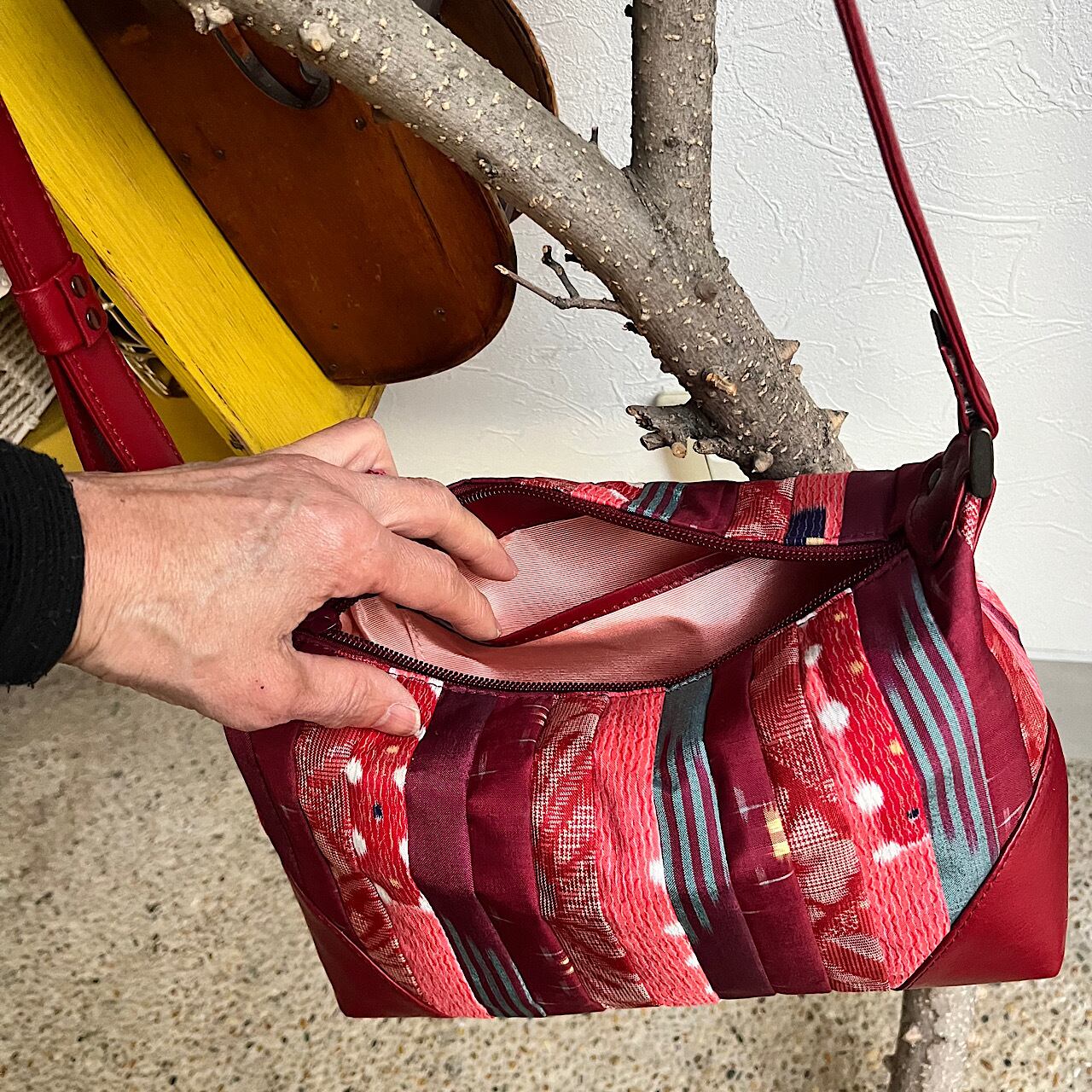 ワインレッドの牛革と銘仙や紬などの着物地(古布)で作りました。