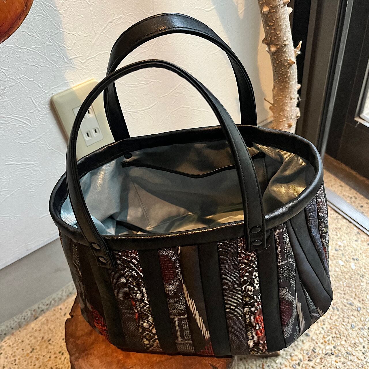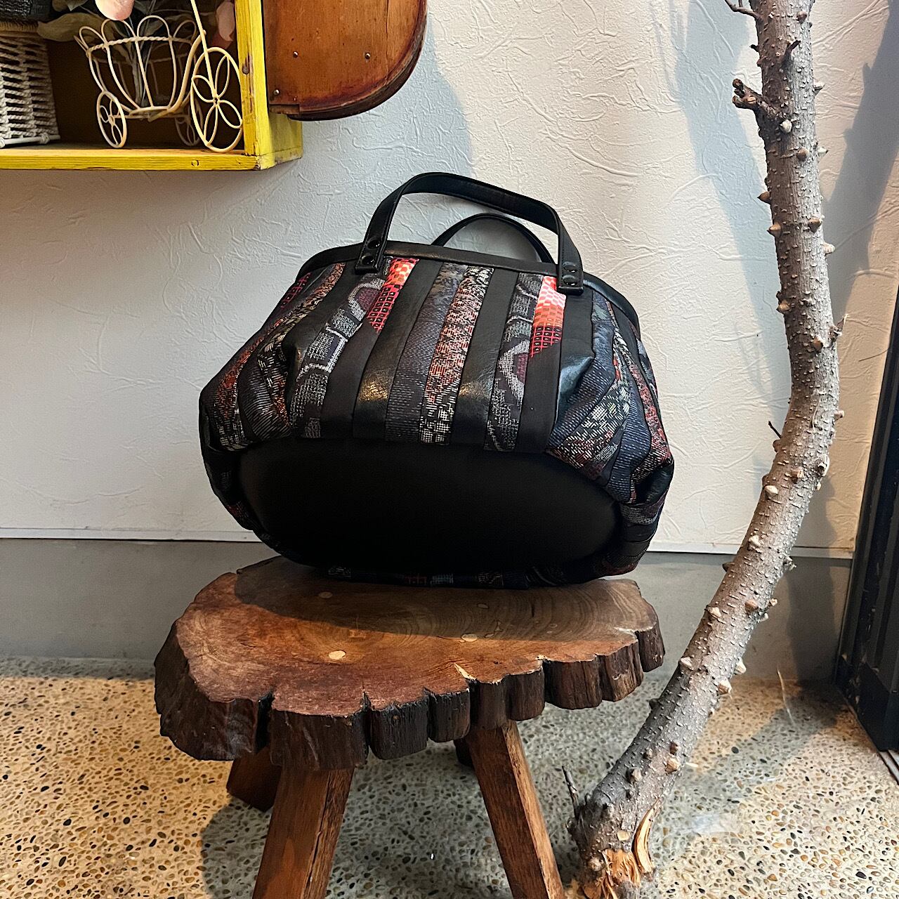 革と古布のパッチワークバッグ(黒の革+着物生地)No.01016-61