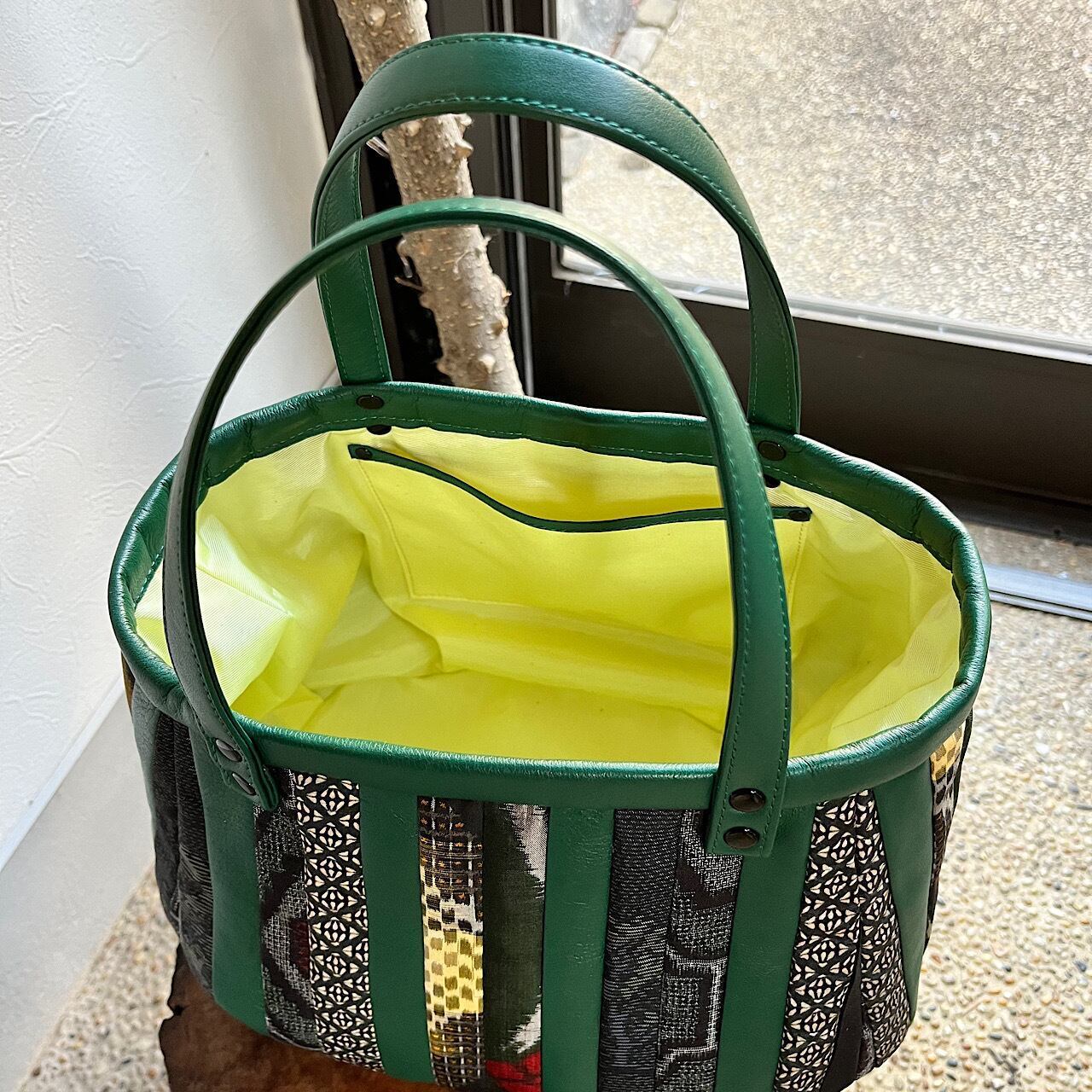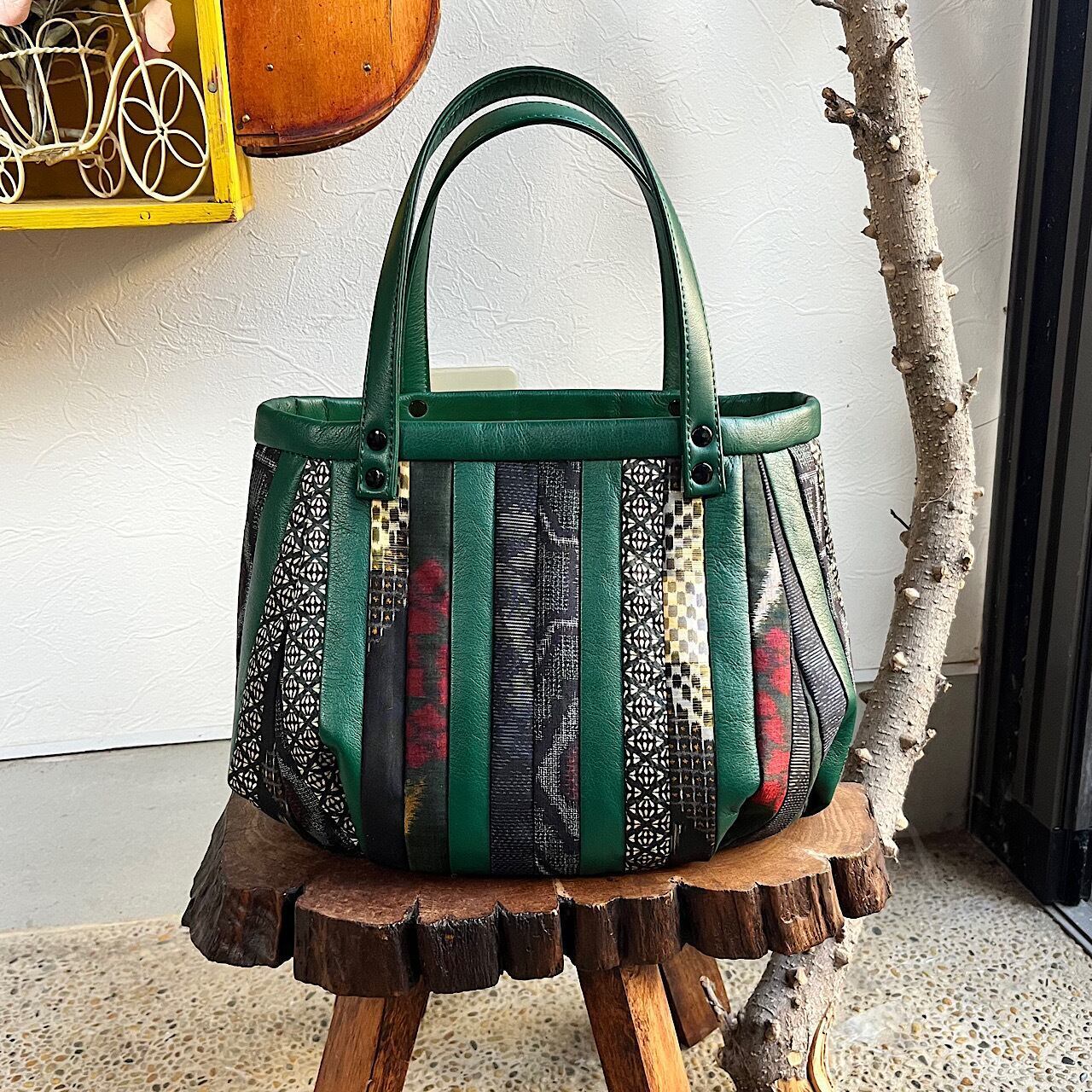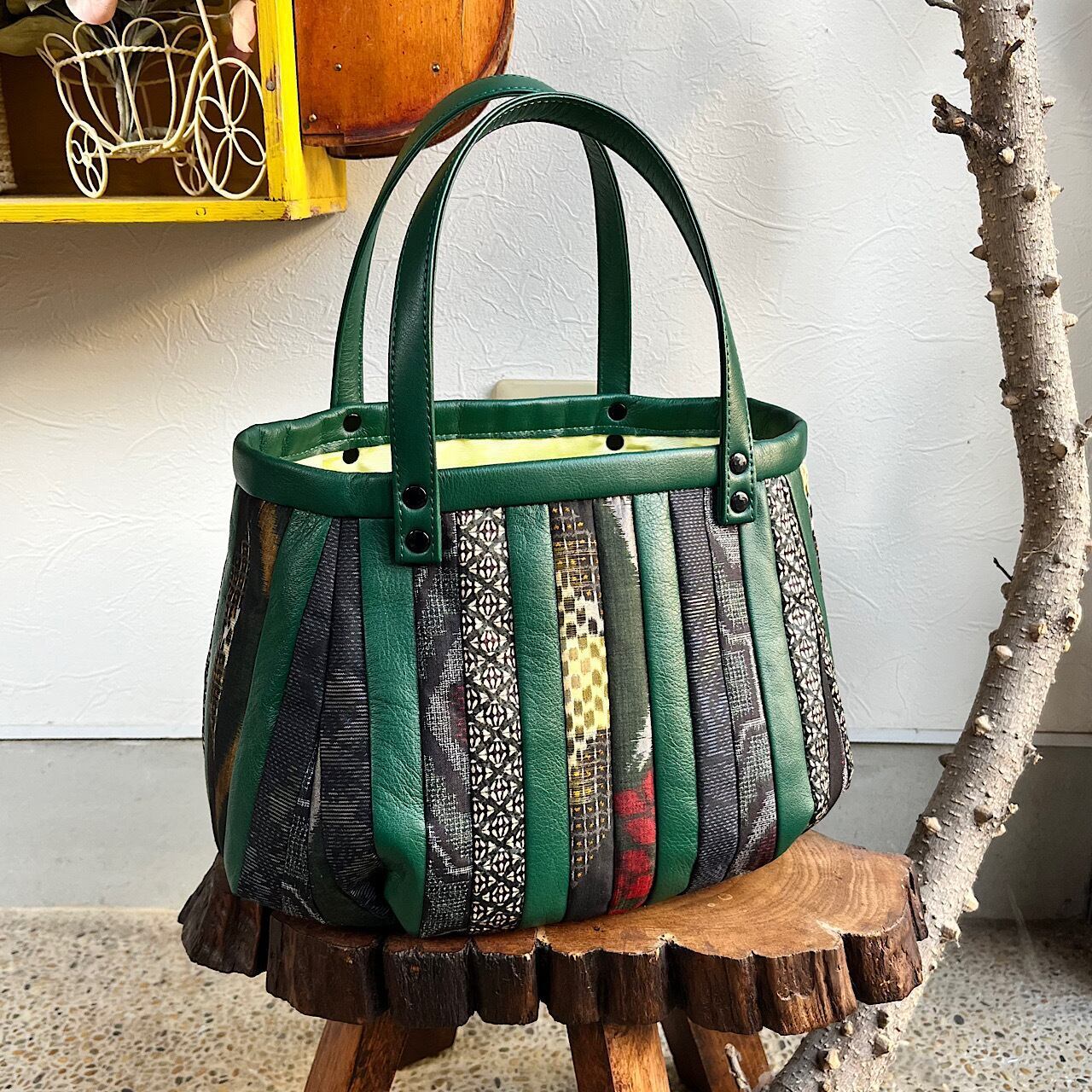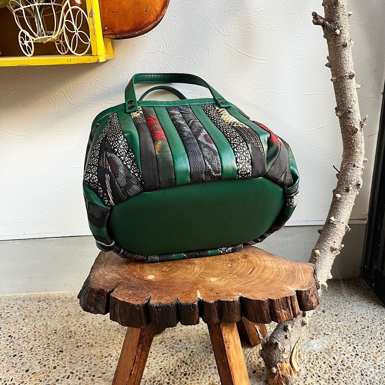 グリーンの牛革と紬や銘仙などの古布と共にパッチワークをして作りました。