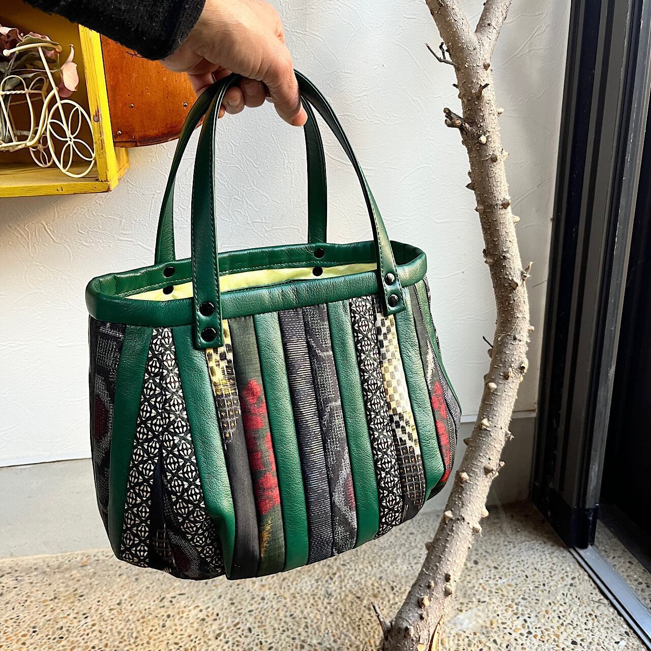 革と古布のパッチワークバッグ(グリーンの革+着物生地)No.01016-62