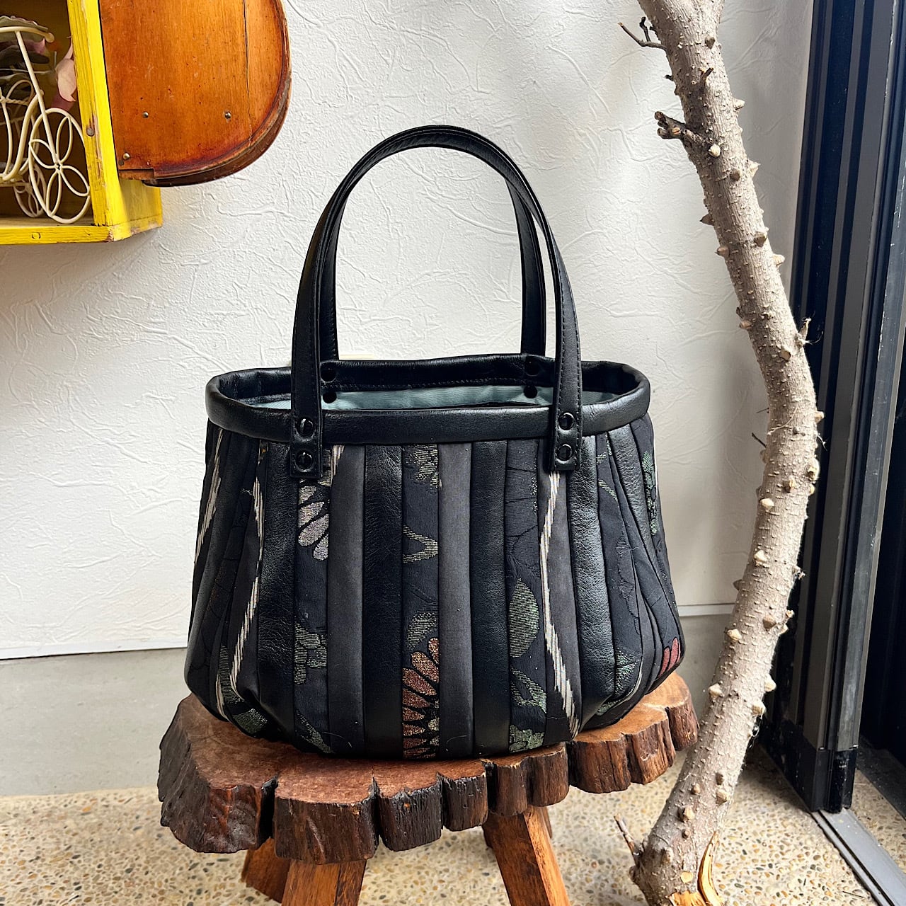 革と古布のパッチワークバッグ(黒の革+着物生地)No.01016-67