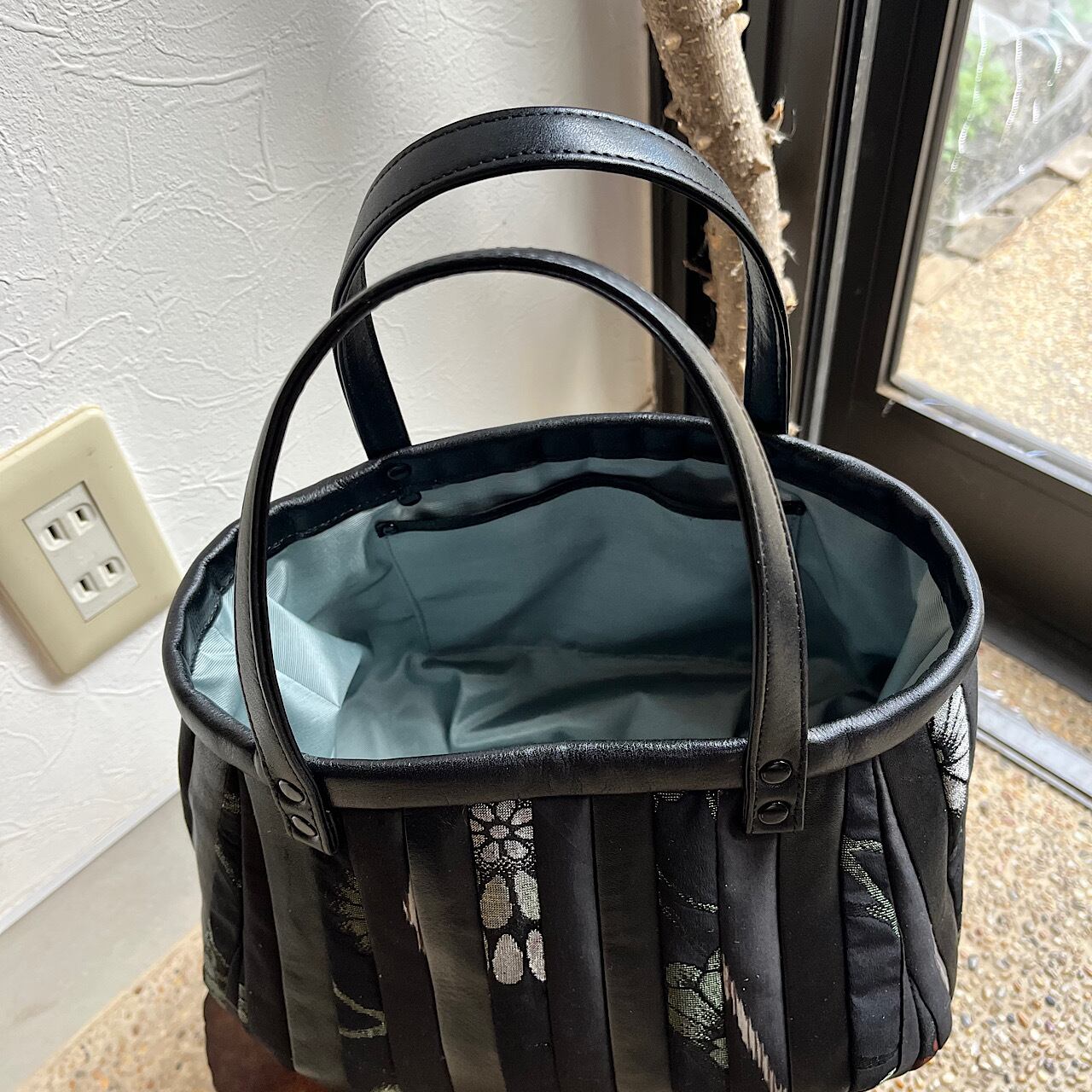 黒の牛革と着物の古布と共にパッチワークをして作りました。