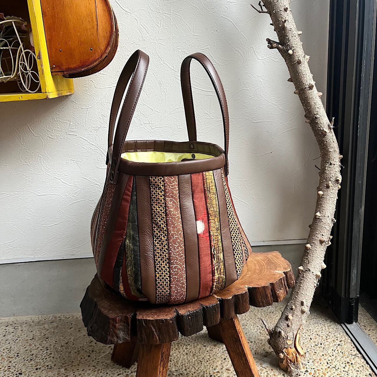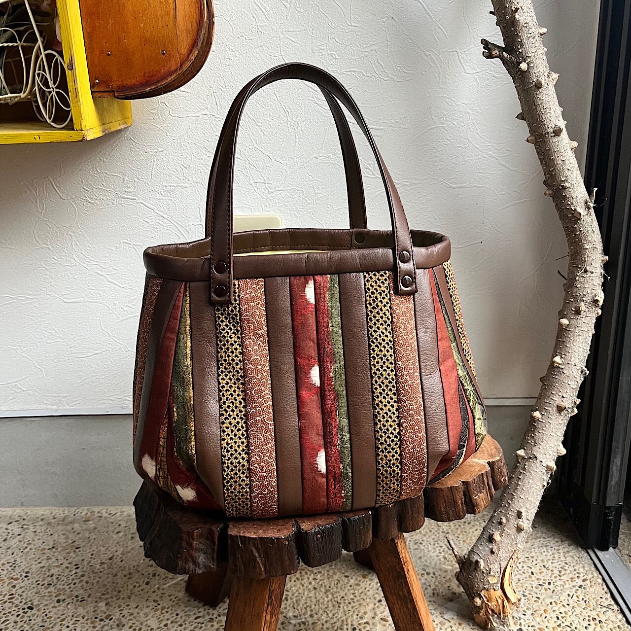 革と古布のパッチワークバッグ(ブラウンの革+着物生地)No.01016-68