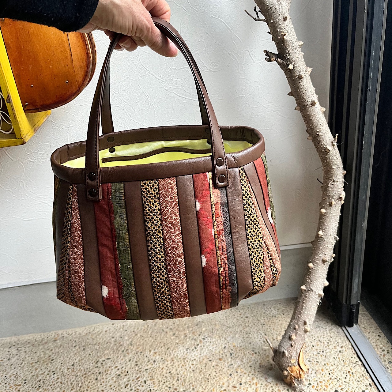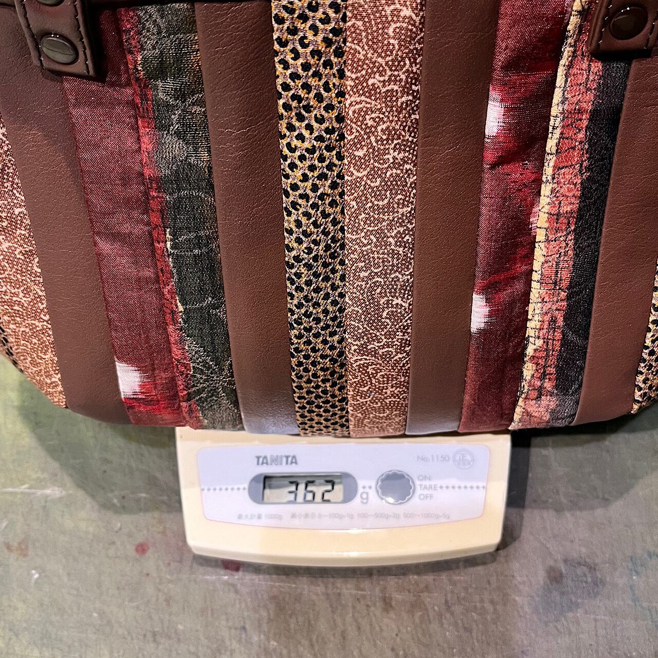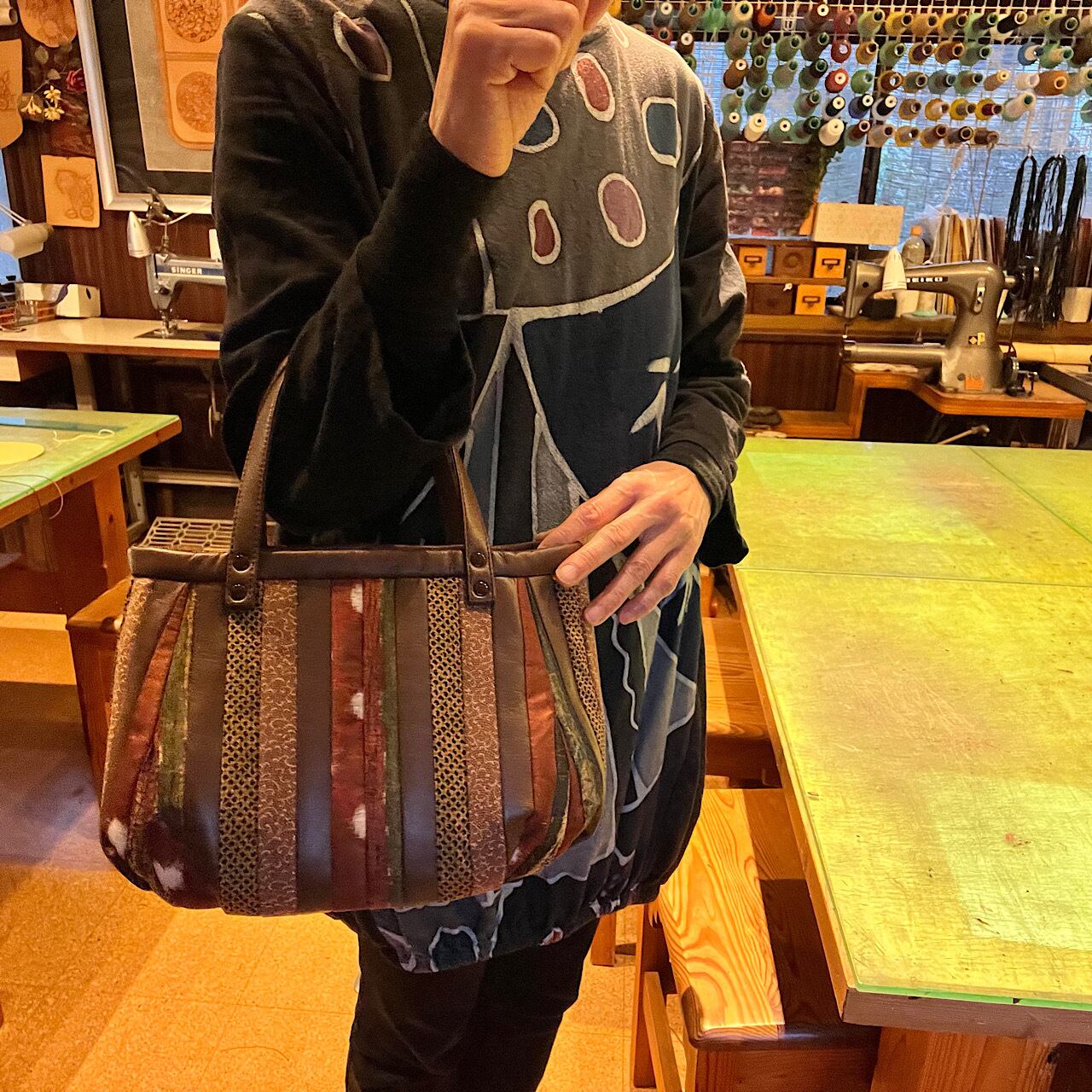 茶色の牛革と着物の古布と共にパッチワークをして作りました。