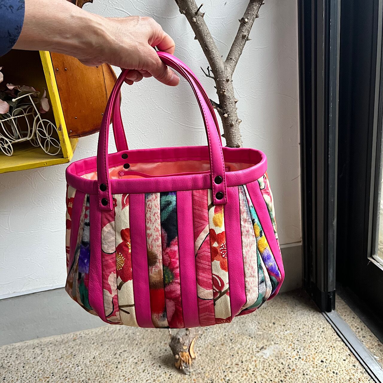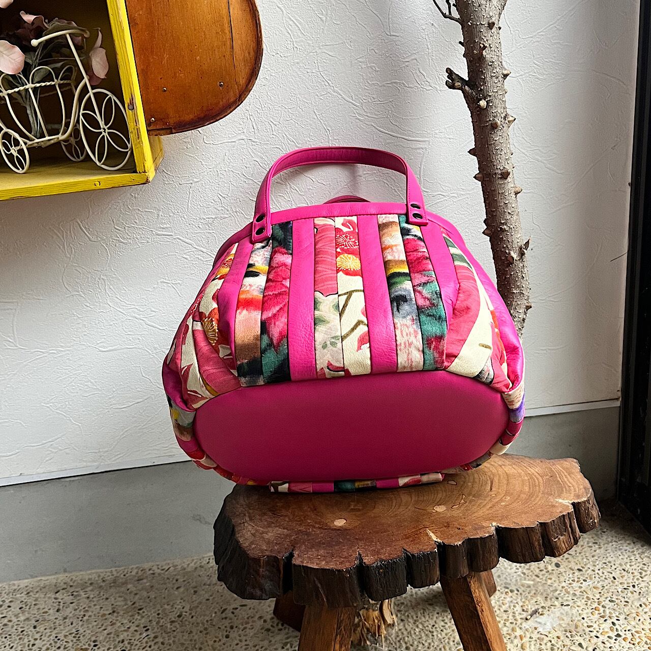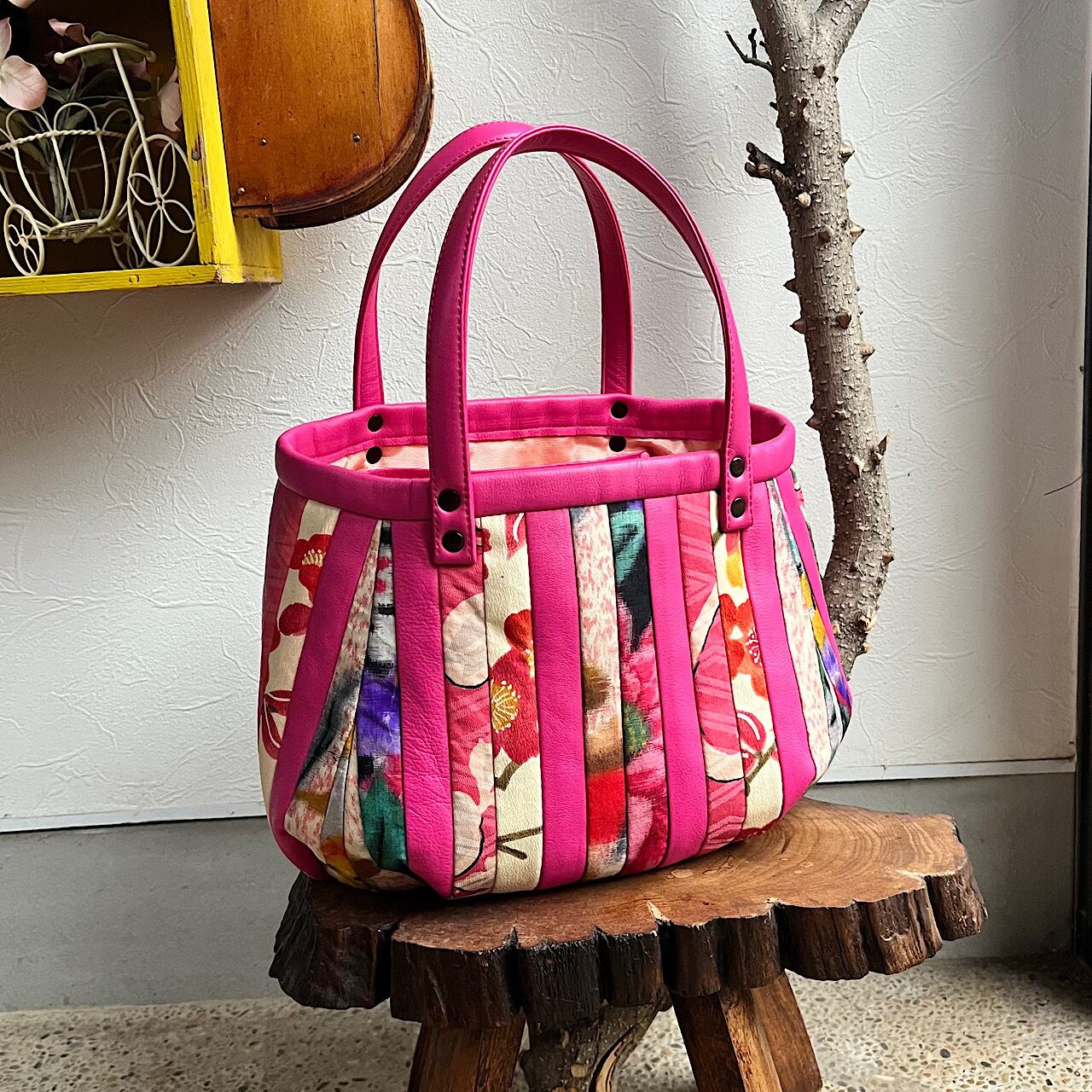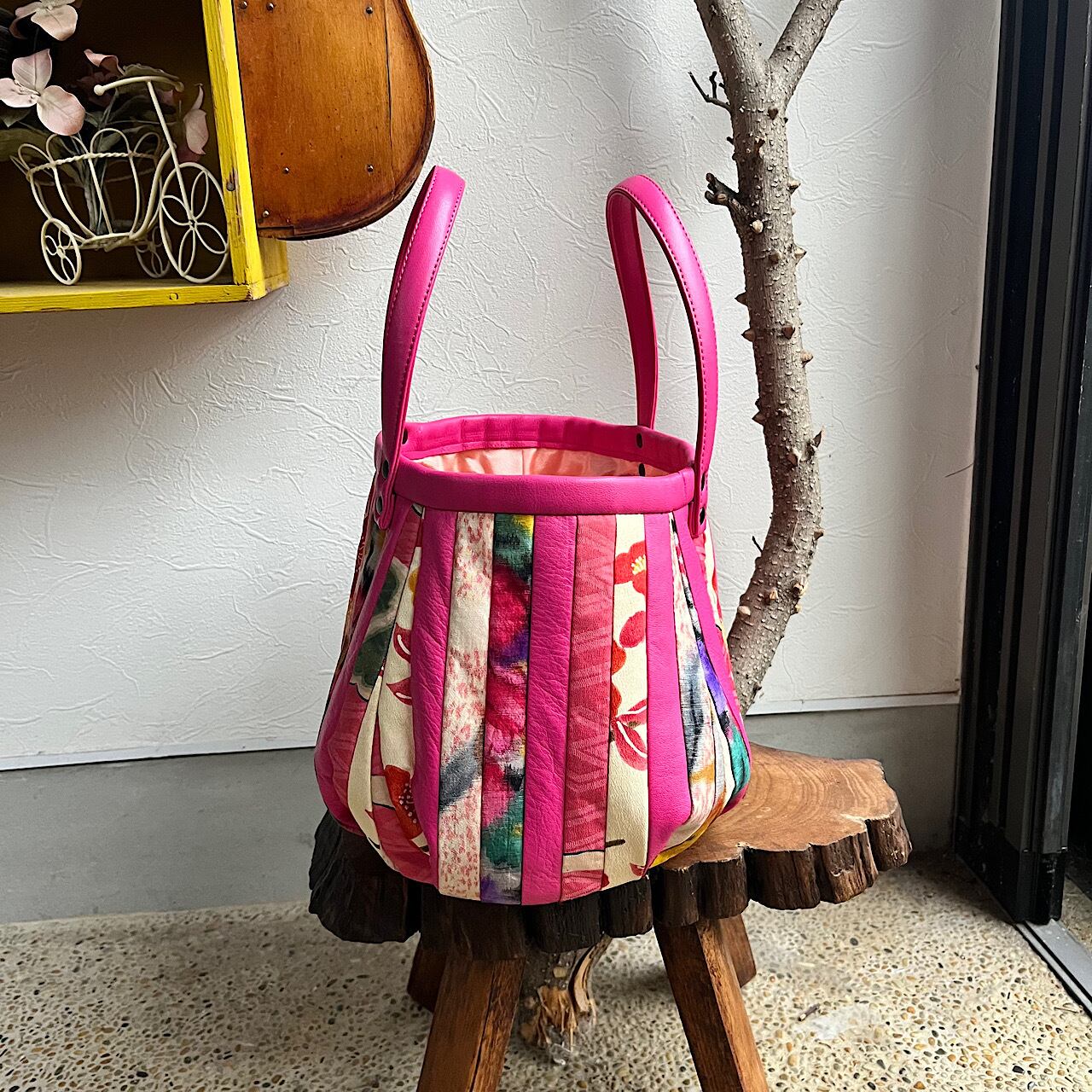 濃いピンクの牛革と着物の古布と共にパッチワークをして作りました。