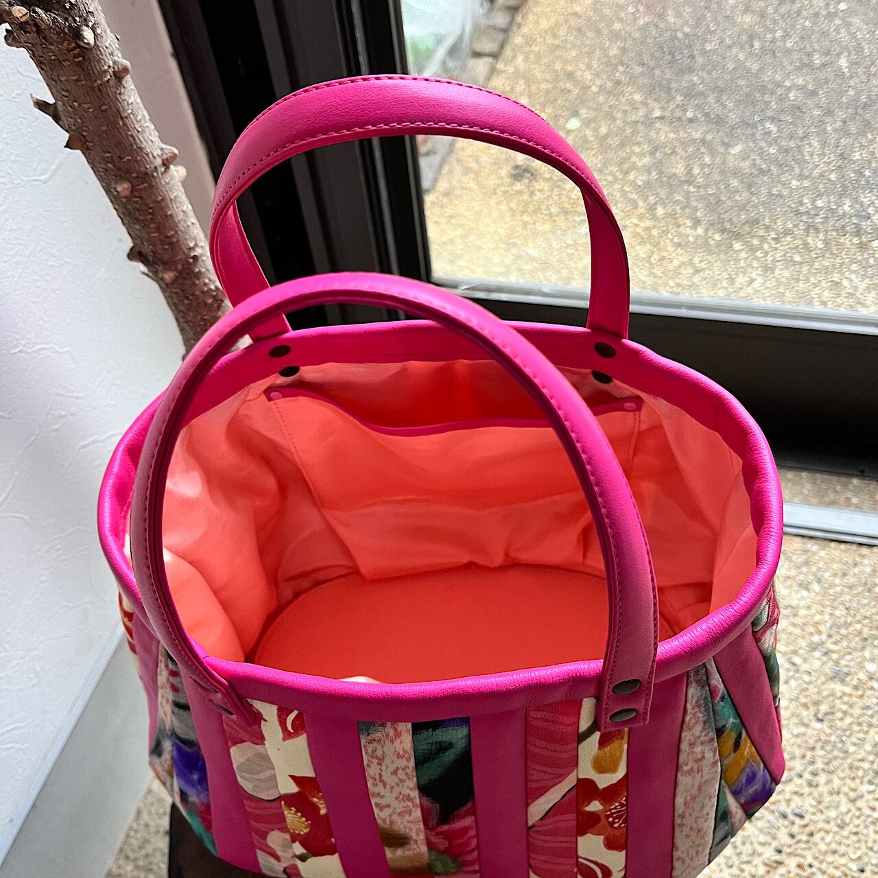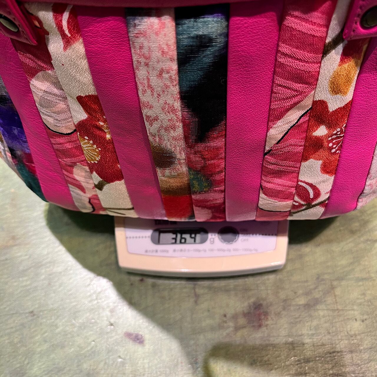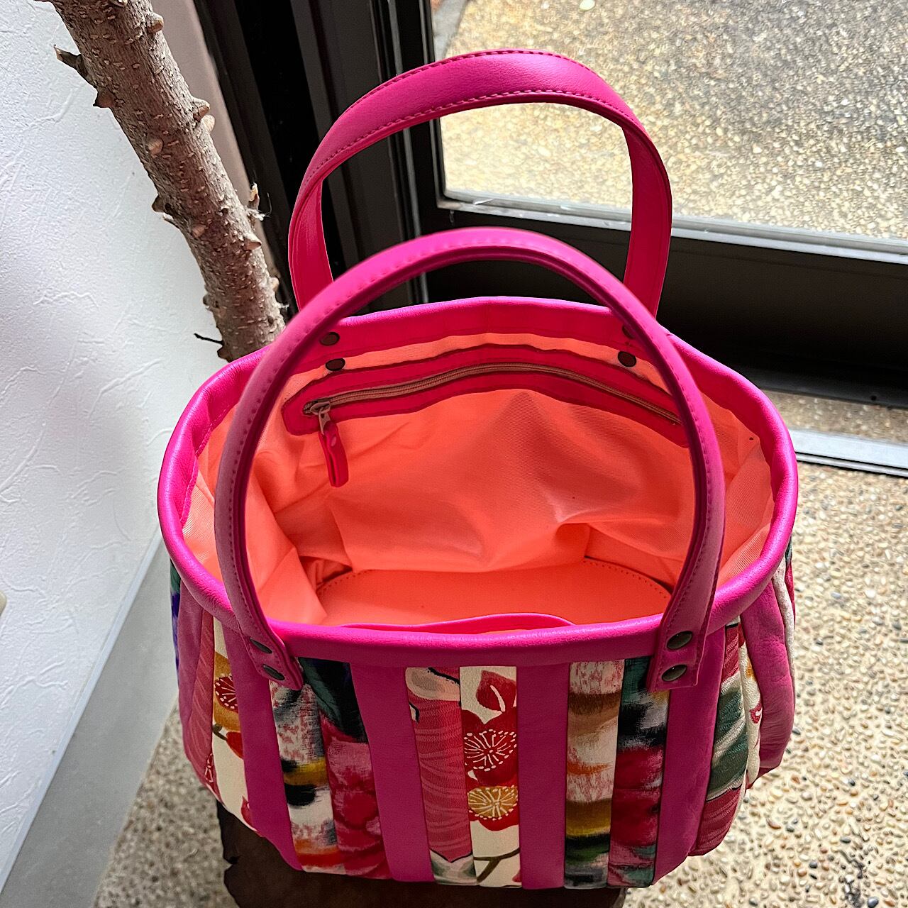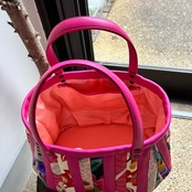 濃いピンクの牛革と着物の古布と共にパッチワークをして作りました。