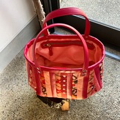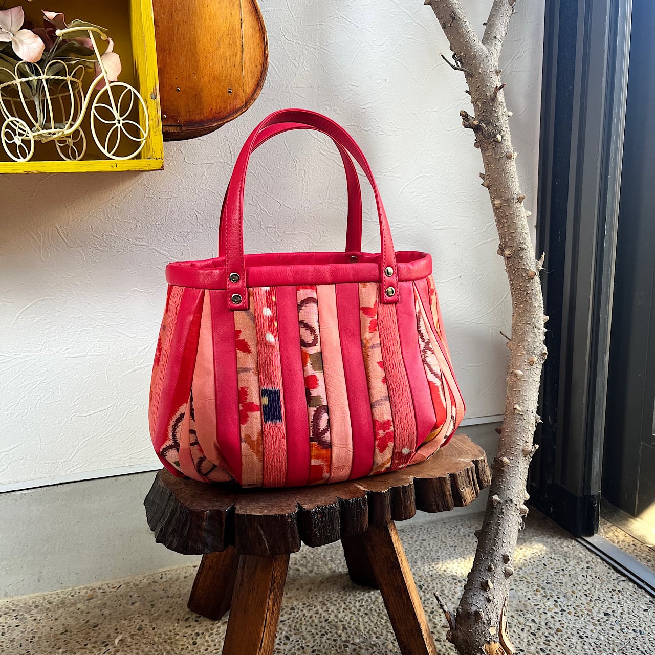 新色のトマトレッドの牛革と着物の古布と共にパッチワークをして作りました。