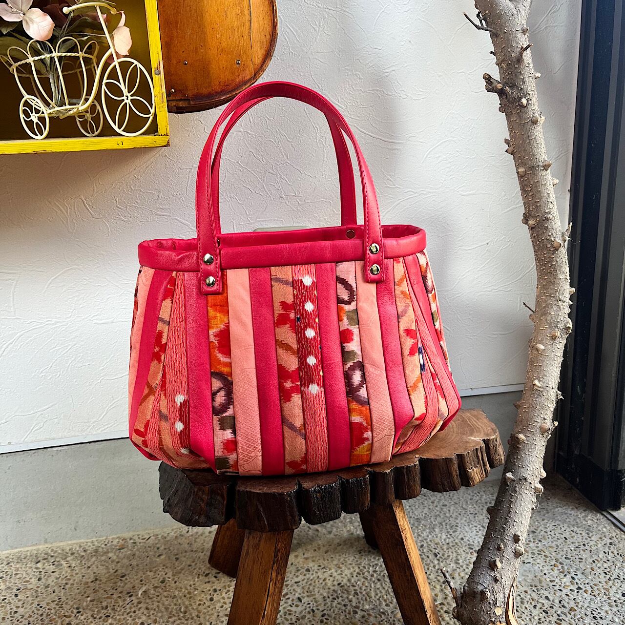革と古布のパッチワークバッグ(トマトレッドの革+着物生地)No.01016-72