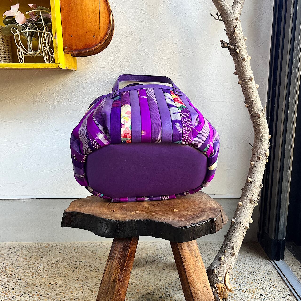 紫色の牛革と着物の古布と共にパッチワークをして作りました。