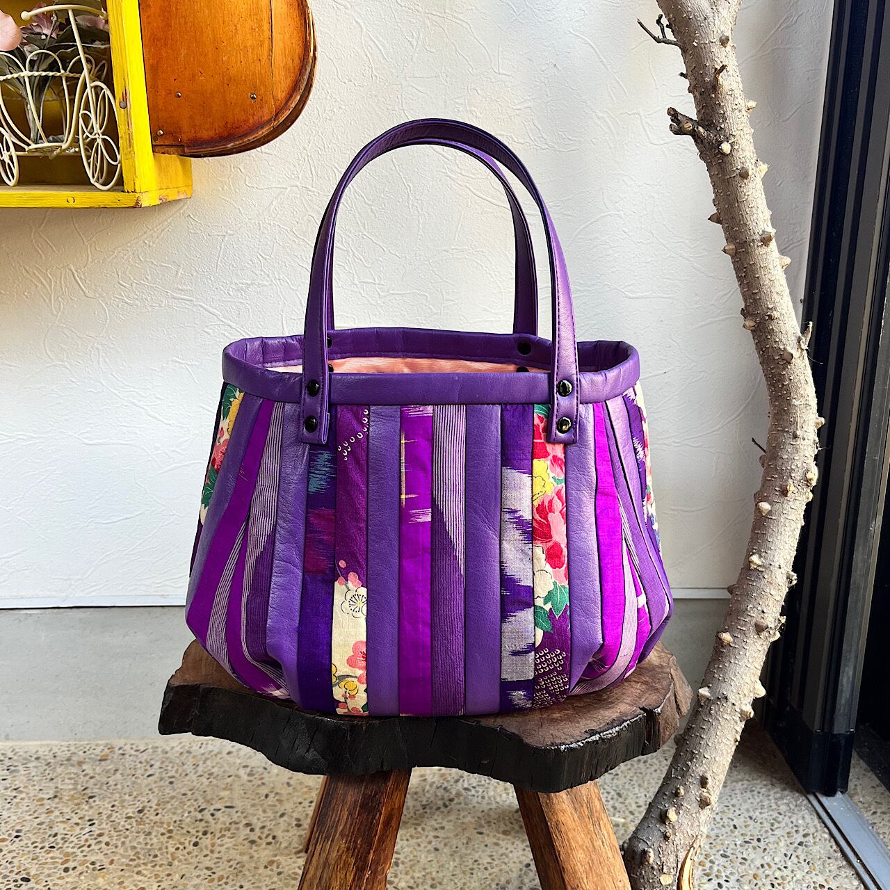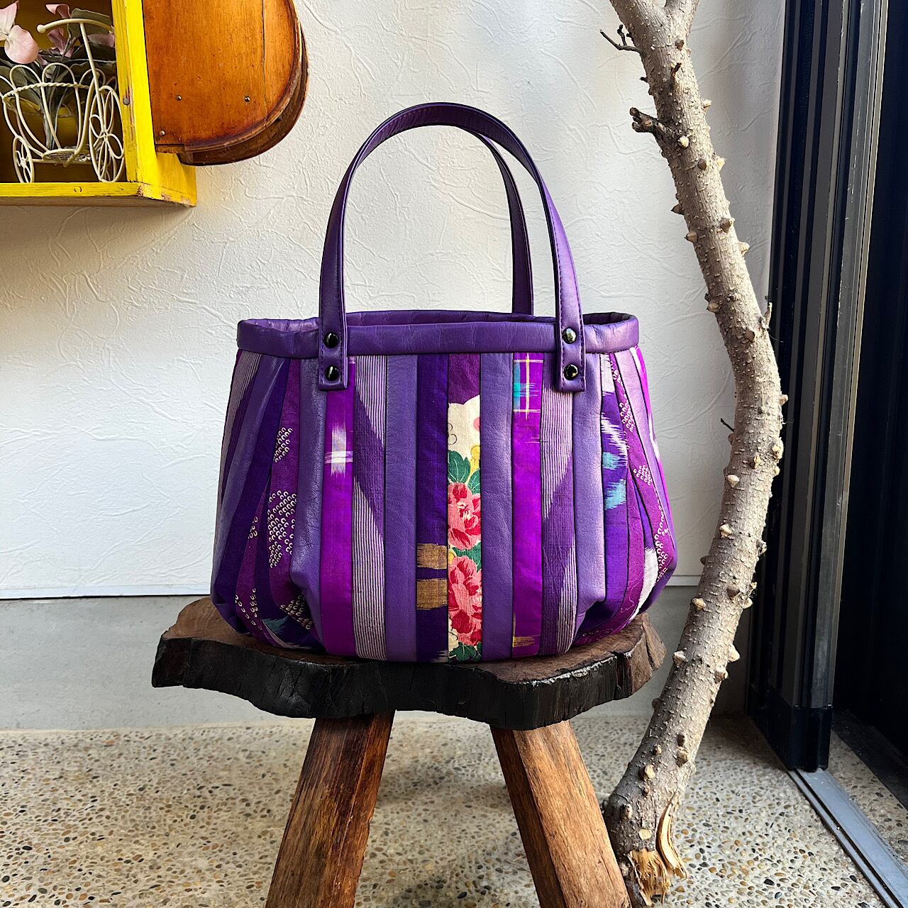 革と古布のパッチワークバッグ(パープルの革+着物生地)No.01016-79